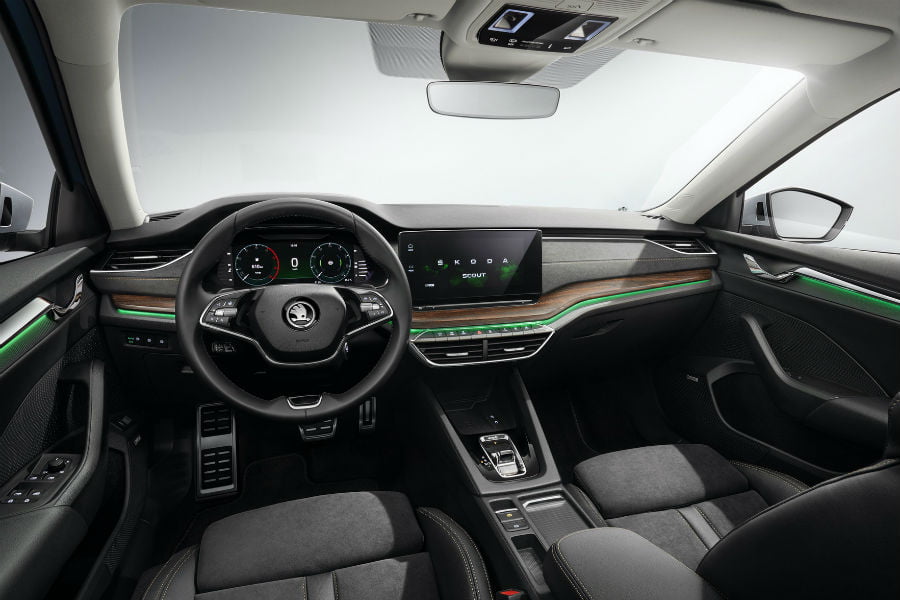 Στο εσωτερικό, η έκταση των αλλαγών συγκριτικά με την Octavia Combi είναι μικρότερη. Οι νέες επενδύσεις με τις καφέ ραφές σε καθίσματα-ταμπλό-τιμόνι είναι χαρακτηριστική, όπως και η ιδίου χρώματος φάσα κατά μήκος του ταμπλό. Ακριβώς από κάτω, ο πράσινος ambient φωτισμός δημιουργεί μια νοητή σύνδεση με τον συνδυασμό καφέ-πράσινου των δασών (κορμός-φύλλωμα δέντρων), τονίζοντας τον εκδρομικά χαρακτήρα του αυτοκινήτου. Το εξελιγμένο σύστημα πολυμέσων Columbus, με οθόνη αφής 10,25 ιντσών, είναι παρόν όπως και όλα τα συστήματα ασφαλείας (αναγνώριση πεζών, αυτόματο φρενάρισμα, Park Assist, ανίχνευση τυφλού σημείου, και Rear Traffic Alert). Στον προαιρετικό εξοπλισμό συναντάμε αφαιρούμενο φακό στο πορτμπαγκάζ, θερμαινόμενο τιμόνι, κλειδί με ρυθμίσεις για τον κάθε οδηγό και αναδιπλούμενα τραπεζάκια στις πλάτες των εμπρός καθισμάτων.