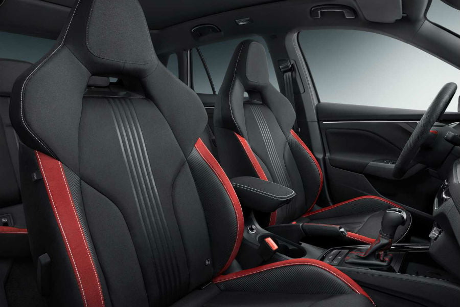 Αντιστοίχως για το εσωτερικό, τα εμπρός καθίσματα με την ενισχυμένη πλευρική στήριξη και το ενσωματωμένο προσκέφαλο διαθέτουν κόκκινες λωρίδες στα πλαϊνά, ενώ ίδιας απόχρωσης διακοσμητικά υπάρχουν στο ταμπλό και στις πόρτες. Κόκκινο χρώμα φέρουν ακόμα οι ραφές στον επιλογέα ταχυτήτων και το δερμάτινο τιμόνι. Δεν λείπουν ο κρυφός φωτισμός, τα πεντάλ αλουμινίου, τα ειδικά πατάκια, ο μαύρος «ουρανός» και τα ανάλογα διακοσμητικά με την επιγραφή «Κamiq» στα μαρσπιέ.