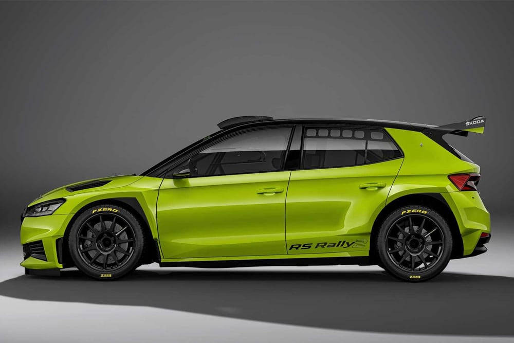 Βαμμένο στο Mamba Green χρώμα κάνει την απαραίτητη νύξη με τα αυτοκίνητα δρόμου, καθώς τόσο η Octavia RS όσο και το Enyaq Coupe RS iV προσφέρονται στην ίδια απόχρωση – σήμα κατατεθέν της Skoda Motorsport. Τα φουσκωμένα φτερά, το αεροδυναμικό πακέτο και οι 18άρες πολυάκτινες ζάντες, που περιβάλλονται από σλικ Pirelli P Zero, κάνουν αγνώριστο το RS Rally2 σε σχέση με την κορυφαία έκδοση δρόμου, το αποκλειστικά μπροστοκίνητο Fabia 1.5 TSI των 150 ίππων.