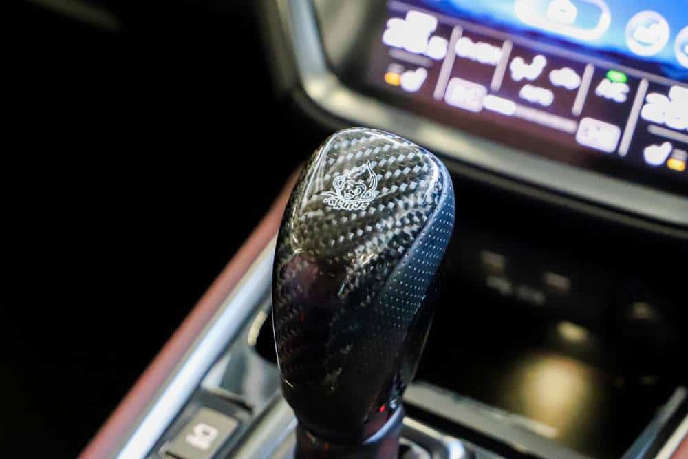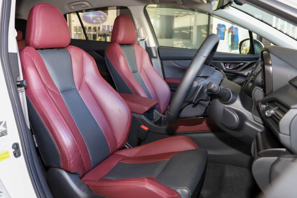 Στο εσωτερικό κυριαρχούν οι δερμάτινες επενδύσεις και η διχρωμία βυσινί-μαύρου, ενώ η μεγάλη οθόνη αφής των 11,6 ιντσών για το σύστημα πολυμέσων και ο ψηφιακός πίνακας οργάνων των 12,3 ιντσών, χαρίζουν στην καμπίνα του μεσαίου estate high tech χαρακτήρα. Μοναδική πινελιά ο λεβιές ταχυτήτων, που φέρει το λογότυπο «Takuty» (και μοιάζει υπερβολικά με «Ευχούλη»). Το ίδιο σήμα βρίσκουμε στα φτερά, την πόρτα του πορτμπαγκάζ και τη θήκη του κλειδιού. Μαρσπιέ, πεντάλ, καθίσματα και τιμόνι προέρχονται όλα από την STI.