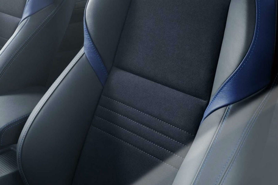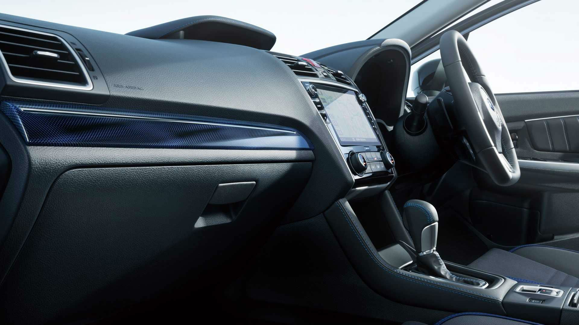 Στο εσωτερικό του σπορτίβ station wagon ξεχωρίζουν οι δίχρωμες δερμάτινες επενδύσεις μπλε – μαύρου, τα μπάκετ καθίσματα με το λογότυπο «STI» στα προσκέφαλα, οι μπλε ραφές, τα αλουμινένια πεντάλ και τα λογότυπα STI.