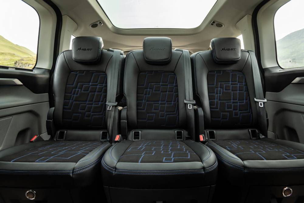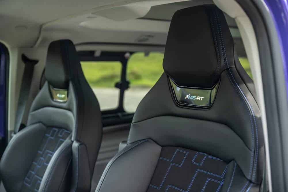 Στο εσωτερικό συναντάμε νέα καθίσματα με σπορ σχεδίαση, που παρέχουν βελτιωμένη άνεση και καλύτερη πλευρική στήριξη. Οι οικολογικές δερμάτινες επενδύσεις και το suede εναλλάσσονται, με τις μπλε ραφές και τα λογότυπα της MS-RT να απαντώνται στο τιμόνι, τα καθίσματα και το ταμπλό. Στα μπάκετ οδηγού-συνοδηγού τα σήματα είναι φωτιζόμενα, ενώ άξιο μνείας το γεγονός ότι όλα τα καθίσματα, και για τους 8 επιβάτες, απολαμβάνουν τις MS-RT περιποιήσεις.