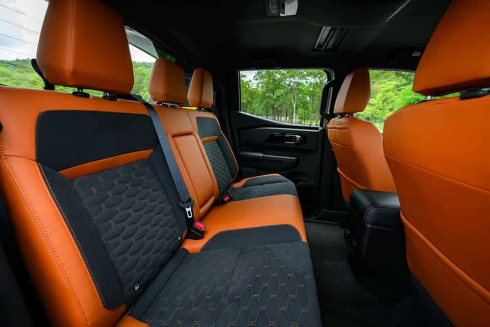 Τα πολύ λεπτά LED ημέρας και η επιβλητική μάσκα Dynamic Shield δεσπόζουν στο εμπρός μέρος, που μοιάζει πολλαπλά πιο μυώδες από το ήδη «βαρβάτο» σημερινό μοντέλο. Τα φουσκωμένα φτερά δίνουν πλάτος και παράστημα, ενώ τα «C» κάτω από τα LED ημέρας βάφονται σε νίκελ ή μαύρη απόχρωση, ανάλογα την έκδοση. Στην κορυφαία πάντως, όπου το μαύρο μοτίβο σε φτερά, μάσκα, προφυλακτήρες, καρότσα και ζάντες συνδυάζεται με πορτοκαλί χρώμα, έχουμε μια από τις πιο σκληροτράχηλες μορφές της κατηγορίας. Πίσω συναντάμε δυο ευμεγέθη (και σημαντικά πιο ογκώδη σε σχέση με το τρέχον L200) φωτιστικά σώματα που υπερτονίζουν το μέγεθος του αμαξώματος, ενώ υπάρχει ακόμα και μια μικρή αεροτομή στο χείλος της καρότσας!
