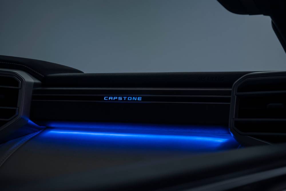 Εκεί, όπου η εικόνα μόνο αγροτικό δεν θυμίζει. Ούτως ή άλλως, η καμπίνα του νέου Tundra παρουσιάζεται ως μια από τις πιο σύγχρονες όλων των εποχών για την κατηγορία. Στο Capstone, ωστόσο, πάει παραπέρα. Ο ψηφιακός πίνακας οργάνων των 12,3 ιντσών και η οθόνη αφής των 14 ιντσών πλαισιώνονται από δερμάτινες επενδύσεις, μαζί με πραγματικό ξύλο σε ταμπλό/κεντρική κονσόλα/πόρτες (αμερικανική καρυδιά, συγκεκριμένα). Το φωτιζόμενο «Capstone» στη μεριά του συνοδηγού και ο ambient φωτισμός δίνουν άλλο αέρα, όπως και η πανοραμική γυάλινη οροφή.