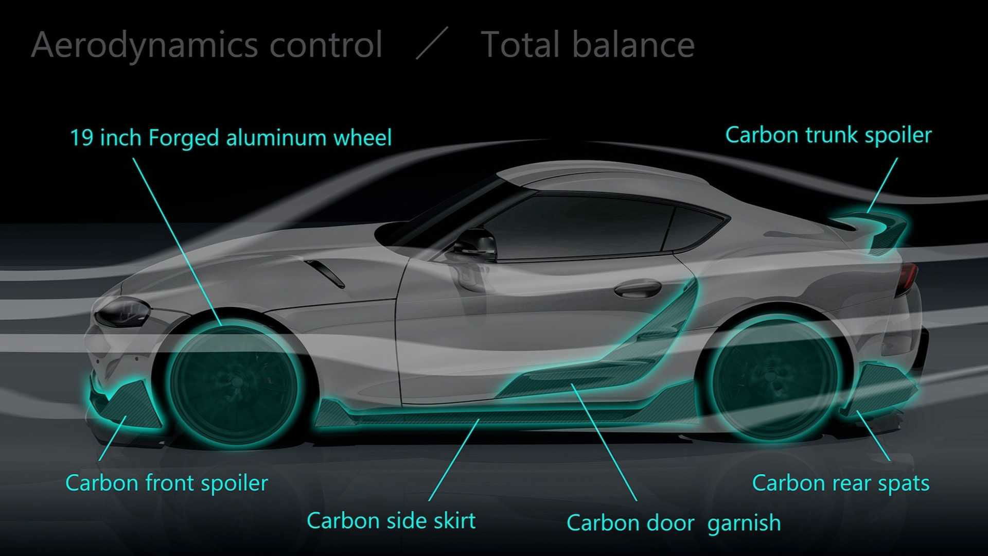 Η Supra TRD Concept είναι εξοπλισμένη με πλήρες αεροδυναμικό κιτ, το οποίο παραπέμπει ευθέως στο εντυπωσιακό πρωτότυπο FT-01 – το πρώτο που είχε «φωτογραφήσει» τον ερχομό της 5ης γενιάς του ιαπωνικού sportscar. Το εμπρός μέρος αποκτά επιθετικό splitter και νέες γρίλιες στους αεραγωγούς, όμως το πλαϊνό και το πίσω είναι αυτά που διαθέτουν τις περισσότερες μετατροπές. Οι «ποδιές» στο πλάι συνδέουν το splitter με τον διαχύτη, έχοντας παράλληλα προσθήκες στο ύψος πίσω από τις πόρτες, εκεί που στην κανονική Supra δημιουργείται η ψευδαίσθηση των εισαγωγών αέρα. Πίσω εντυπωσιάζει το μέγεθος του διαχύτη και τα αεροδυναμικά του ακροπτερύγια, που εκτείνονται σχεδόν πέρα από το πλάτος του προφυλακτήρα. Φυσικά δεν θα μπορούσε να λείπει και το ανάλογο spoiler στην πόρτα του πορτμπαγκάζ.