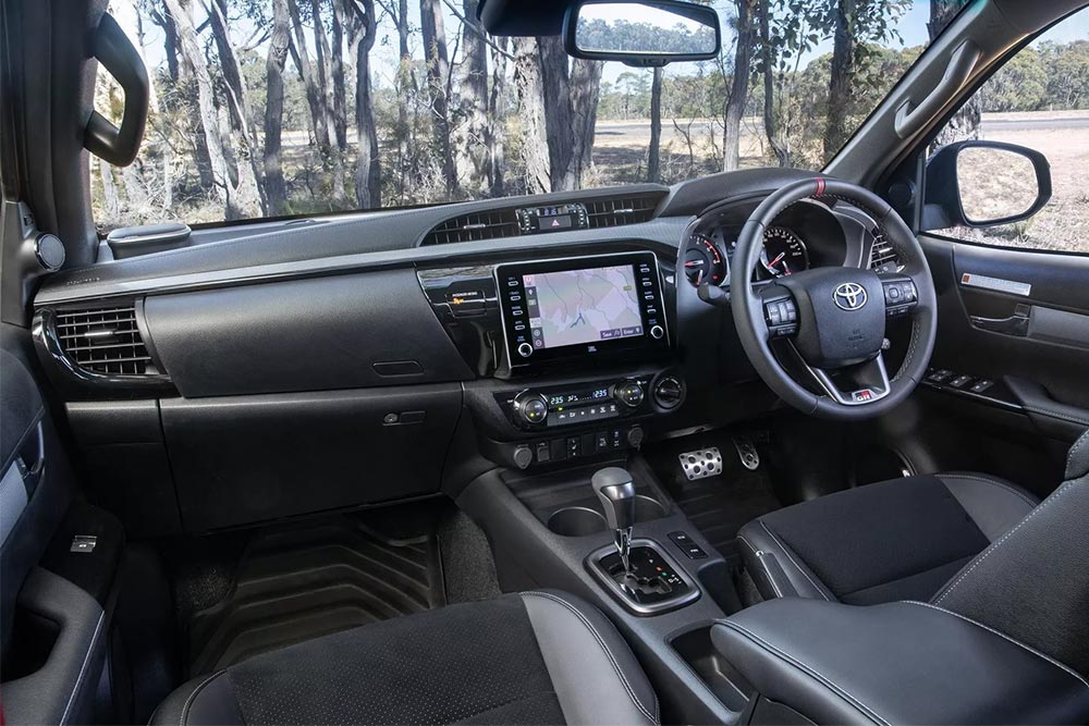 Στο εσωτερικό με τον σκουρόχρωμο διάκοσμο ξεχωρίζουν τα σπορ μεταλλικά πεντάλ, οι κόκκινες ζώνες ασφαλείας και το σπορ τιμόνι. Φυσικά και εντός του Hilux GR Sport υπάρχουν λογότυπα GR Sport, όπως είναι στο τιμόνι και στα προσκέφαλα.