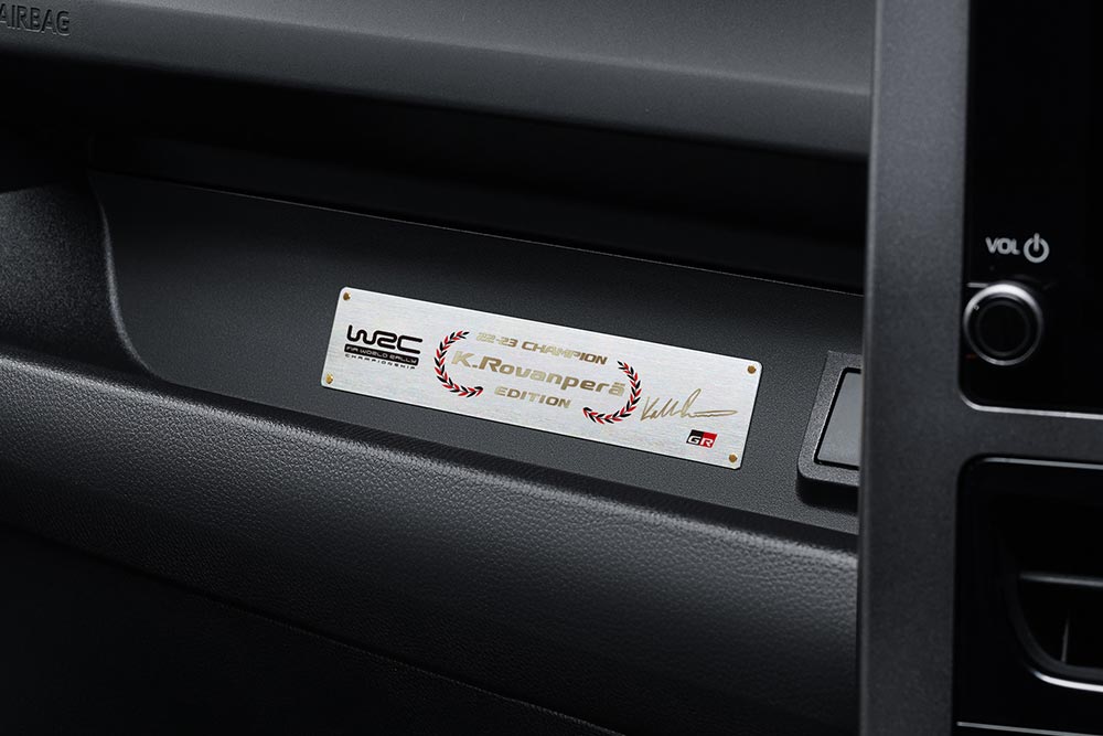 Το αυτοκίνητο έχει αποκλειστικό φινίρισμα τριών τόνων, εφαρμοσμένο ως μια σειρά από ζωγραφισμένα μοτίβα από τον σχεδιαστή του αγωνιστικού κράνους του Rovanperä. Τα αυτοκόλλητα νίκης του WRC προστέθηκαν στα μπροστινά φτερά και υπάρχουν αυτοκόλλητα Toyota Gazoo Racing στις πόρτες και στον πίσω προφυλακτήρα και ένα σήμα Rovanperä Edition στην πίσω πόρτα. Εκτός από τις ζάντες BBS 18x8J, το αυτοκίνητο είναι εξοπλισμένο με πίσω αεροτομή μεταβλητής πτέρυγας CFRP, κοινό με το GRMN Yaris. Στην καμπίνα, τα τελειώματα και οι ραφές της ταπετσαρίας ταιριάζουν και πάλι με τα εθνικά χρώματα του οδηγού, σε αυτήν την περίπτωση το μπλε και το γκρι για τη Φινλανδία. Όπως και στην έκδοση Ogier, μια ειδική πλακέτα τιμά τη νίκη της TGR στο WRC.