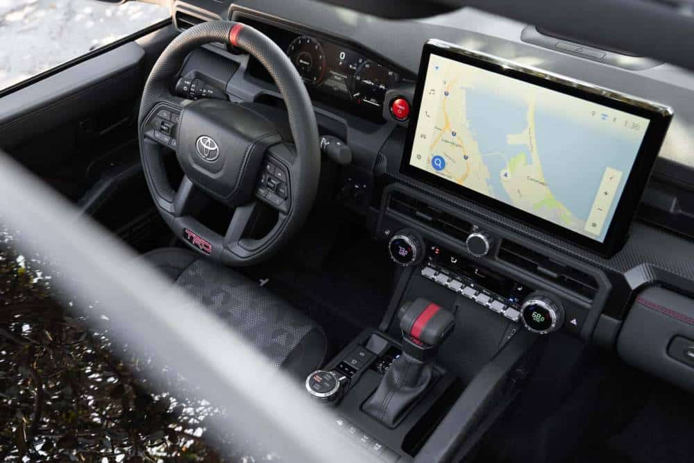 Ανάλογο άλμα σε σχέση με το απερχόμενο Tacoma συναντάμε και στο εσωτερικό. Αναλόγως έκδοσης ο πίνακας οργάνων είναι είτε κανονικός 7 ιντσών είτε ψηφιακός 12,3 ιντσών, ενώ η οθόνη αφής για το σύστημα πολυμέσων ποικίλει μεταξύ 8 και 14 ιντσών. Η ψηφιακότητα και οι εργονομικές εφαρμογές είναι το φόρτε του νέου Tacoma, καθώς Android Auto και Apple CarPlay είναι στάνταρ, προσφέρεται ηχοσύστημα JBL με 10 ηχεία (το ένα φορητό) και είσοδος χωρίς κλειδί, αλλά και ειδικά σχεδιασμένες αντιολισθητικές λαβές, μαζί με πολλές θήκες μικροαντικειμένων. Αναμφίβολα, ωστόσο, το πιο εντυπωσιακό κομμάτι στην καμπίνα του ιαπωνικού pick up είναι τα καθίσματα IsoDynamic Performance του TRD Pro, που έχουν στις πλάτες τους αμορτισέρ!