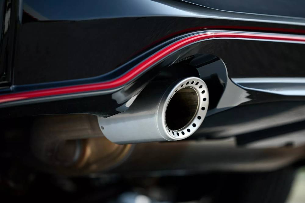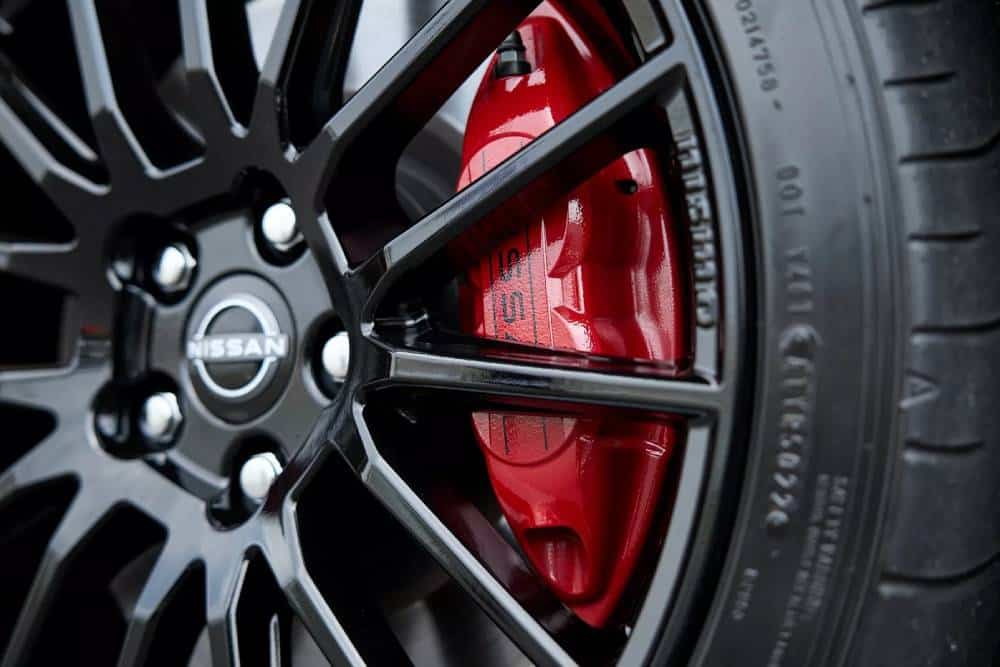 Το ιδιαίτερο χρώμα Stealth Gray, που πρωτογνωρίσαμε στο Nismo GT-R, δεν θα μπορούσε να μην ντύνει το κορυφαίο Skyline, μαζί με πληρέστατο αεροδυναμικό πακέτο που αποτελείται από splitter εμπρός, ποδιές στο πλάι, διαχύτη πίσω και ένα προτεταμένο χείλος στην πόρτα του πορτμπαγκάζ. Ο χρωματικός συνδυασμός των βοηθημάτων εξυπακούεται πως είναι ο κλασικός για Nismo μαύρου-κόκκινου, ταιριάζοντας γάντι με την ανθρακί απόχρωση του αμαξώματος. Εννοείται πως μαύρες είναι και οι 19άρες πολυάκτινες ζάντες της Enkei, ωστόσο εδώ το καθιερωμένο κόκκινο σιρίτι στο «δαχτυλίδι» απουσιάζει. Αναπληρώνει με το παραπάνω πάντως το θεαματικό φως ομίχλης στο διαχύτη, που παραπέμπει ευθέως στα αγωνιστικά GT-R του Ιαπωνικού Πρωταθλήματος Τουρισμού.