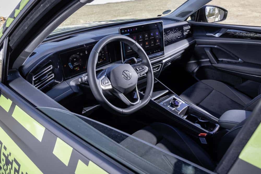 Πρώτο και κυριότερο στοιχείο που τραβάει τα βλέμματα, η μεγάλη οθόνη αφής των 15 ιντσών στην κορυφή του ταμπλό. Μεταφερμένη σχεδόν αυτούσια από το ηλεκτρικό ID.7, συνοδεύεται από ψηφιακό πίνακα οργάνων 10,25 ιντσών στα αριστερά και μια φάσα στο ταμπλό εκ δεξιών που θυμίζει, αλλά δεν είναι οθόνη μπροστά από το συνοδηγό. Η ίδια επένδυση απαντάται και στο πάνω μέρος των θυρών, ενώ παρατηρούμε την ελάχιστη παρουσία φυσικών διακοπτών στην κεντρική κονσόλα. Από όσο μπορούμε να διακρίνουμε πλήκτρα αφής αναλαμβάνουν τον έλεγχο των επιμέρους λειτουργιών, με το περιστροφικό χειριστήριο στη βάση να φροντίζει για την περιήγηση στο μενού. Ο επιλογέας του κιβωτίου έχει μετακομίσει στην κολώνα του τιμονιού, όπως στα μοντέλα ID., προς βελτίωση των χώρων και της πρακτικότητας.