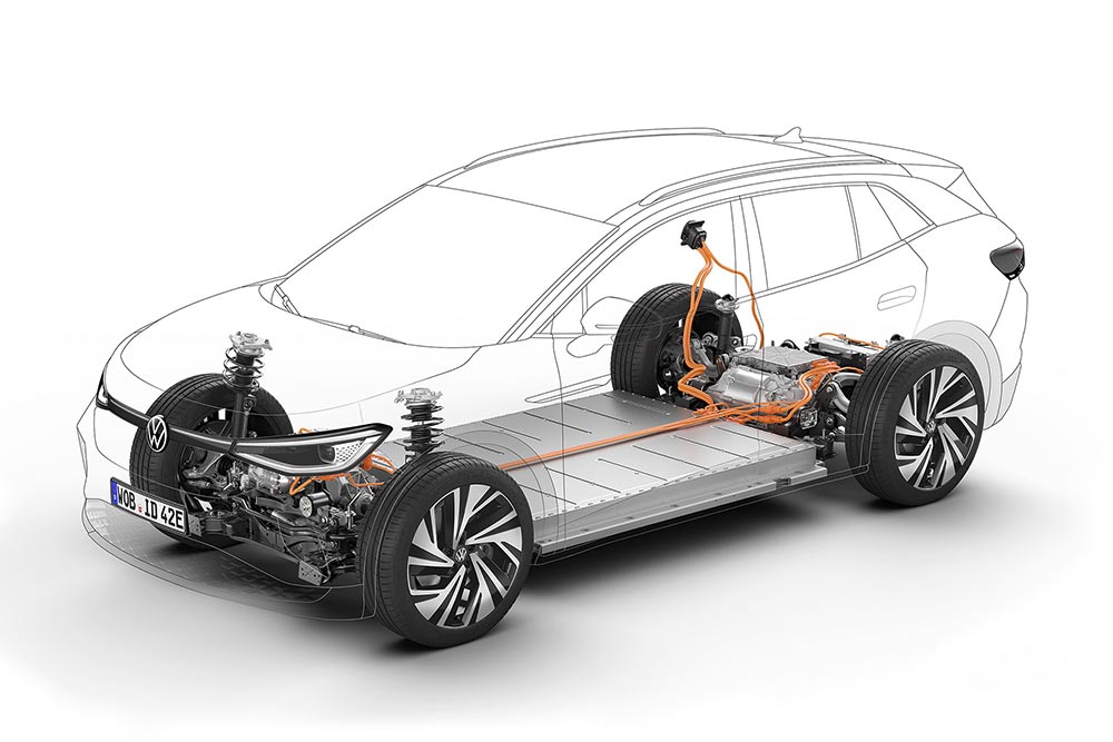 Η τετρακίνηση του ID.4 GTX βασίζεται σε ένα έξυπνο σύστημα ελέγχου και καθορίζει πώς κατανέμεται η διαθέσιμη ροπή κίνησης στους δύο ηλεκτρικούς κινητήρες. Τις περισσότερες φορές θα λειτουργεί μόνο ο κινητήρας στον πίσω άξονα. Ο εμπρός ενεργοποιείται όταν το απαιτήσουν το επιθυμητό στυλ οδήγησης ή η ανάγκη για αυξημένη πρόσφυση. Το ID.4 GTX διαθέτει επίσης ευφυή ανάκτηση ενέργειας μέσω της πέδησης. Ο οδηγός χρησιμοποιεί τον επιλογέα ταχυτήτων για να αποφασίσει εάν το ID.4 GTX θα πρέπει να ρολάρει ελεύθερα ή να ανακτά ενέργεια μόλις σηκώσει το πόδι του από το φρένο. Εάν η θέση D είναι ενεργοποιημένη, το αυτοκίνητο θα ρολάρει στις περισσότερες περιπτώσεις, ενώ οι ηλεκτροκινητήρες περιστρέφονται με σχεδόν μηδενικό φορτίο. Στη θέση Β, οι κινητήρες λειτουργούν ως γεννήτριες, τροφοδοτώντας ξανά την μπαταρία. Τέλος διαθέσιμα είναι διαφορετικά προγράμματα οδήγησης, (Eco, Comfort, Sport, Individual, Traction), που μεταβάλλουν αντίστοιχα την οδική συμπεριφορά του γρήγορου ID.4 GTX. Στον προαιρετικό εξοπλισμό ανήκει επίσης και το πακέτο Sport, που χαμηλώνει κατά 15 χλστ. το αμάξωμα. Στο ίδιο πακέτο ενσωματώνονται κι ενεργά αμορτισέρ, συνδυασμός που ενισχύει την άνεση αλλά και το κράτημα. Οι ηλεκτροκινητήρες αντλούν ενέργεια από την μπαταρία των 77 kWh, η οποία προσφέρει αυτονομία 480 χλμ. με μια φόρτιση. Επιπλέον υπάρχει η δυνατότητα ταχείας φόρτισης 125 kW κάτι που σημαίνει πως με 30 λεπτά στον ταχυφορτιστή και το VW ID.4 GTX αποκτά αυτονομία 300 χλμ.!