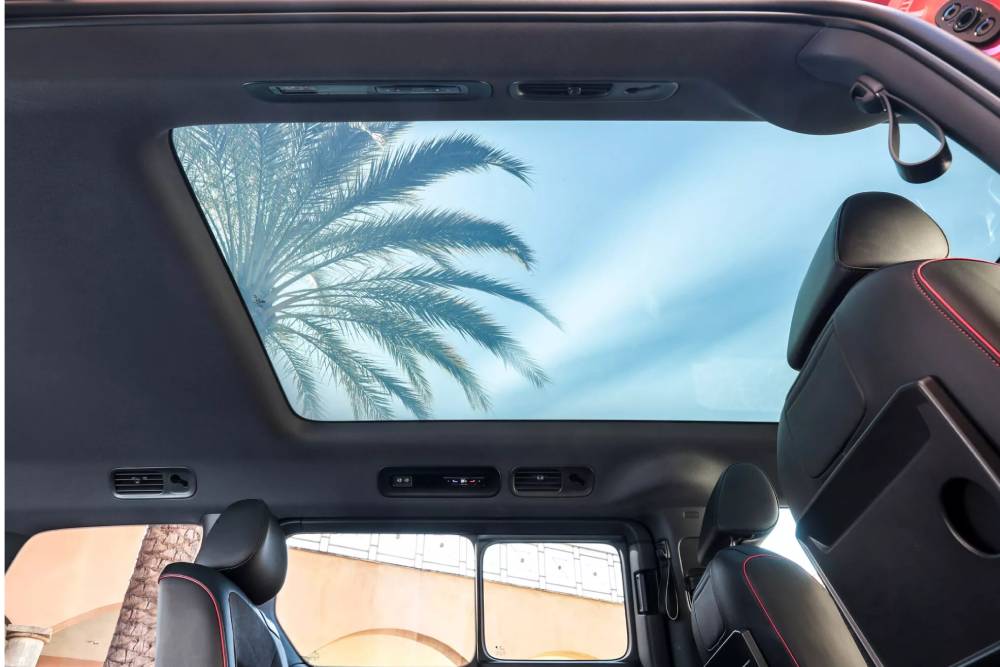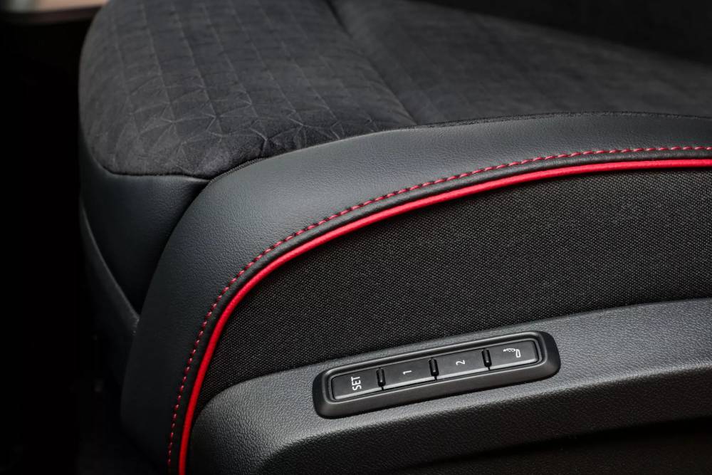 Η «rossonero» διχρωμία απαντάται στο εσωτερικό, με εκτενέστερη παρουσία του κόκκινου χρώματος στις ραφές, το ταμπλό, τις πόρτες και την κεντρική κονσόλα. Μεγάλο ρόλο στο «κοκκίνισμα» της καμπίνας, βέβαια, παίζει και ο ambient φωτισμός, που καλύπτει από άκρη σε άκρη τις επιφάνειες εμπρός από οδηγό-συνοδηγό. Τα μπάκετ καθίσματα και τα νέα γραφικά σε infotainment-ψηφιακό καντράν βάζουν τις δικές τους πινελιές, ενώ αξίζει να σημειωθεί πως όλα τα καθίσματα (σε 5θέσια, 6θέσια ή 7θέσια διάταξη) ντύνονται με suede και δέρμα. Η τεράστια πανοραμική ηλιοροφή είναι προαιρετική, όχι όμως και το σύστημα πολυμέσων με ChatGPT και οθόνη 12,9 ιντσών.