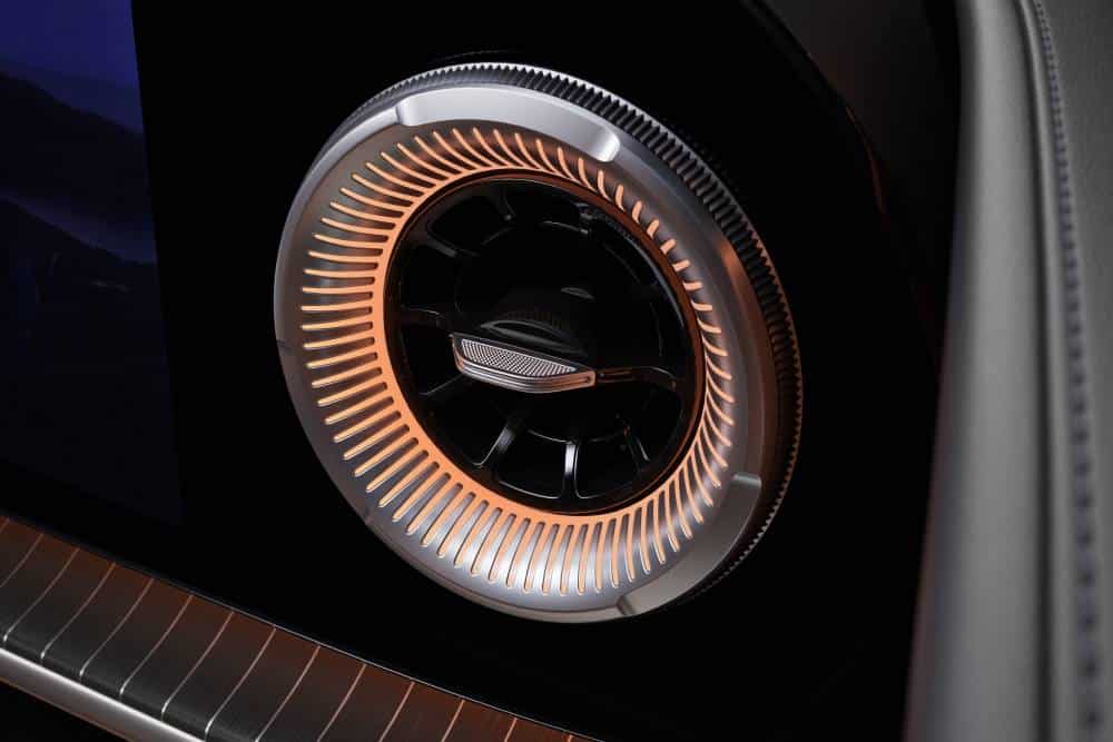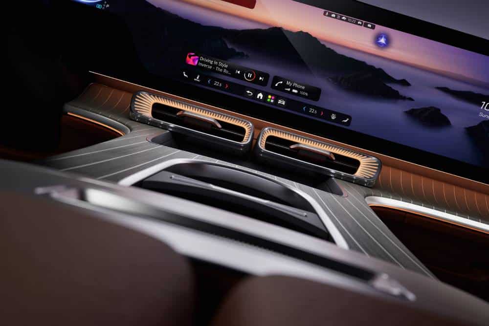 Τα χειριστήρια του κλιματισμού αλλάζουν για λίγο το χρώμα του ατμοσφαιρικού φωτισμού και του φωτισμού αεραγωγών για να επιβεβαιώσουν τις επιλογές. Τα πάνελ των θυρών είναι λιτά και διαθέτουν εντυπωσιακές μεταλλικές γρίλιες στα ηχεία, ενώ ο σχεδιασμός των δερμάτινων καθισμάτων είναι εξίσου καθαρός και μινιμαλιστικός. Σε συνδυασμό με νέα εντυπωσιακά ατμοσφαιρικά στυλ, η ολοκαίνουργια MBUX HYPERSCREEN δημιουργεί μια σαφώς καθορισμένη αίσθηση ψηφιακής κομψότητας και οδηγεί σε μια συναρπαστική, καθηλωτική εμπειρία εσωτερικού χώρου.