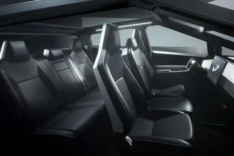 Το μήκος φτάνει τα 5.885 χλστ., το πλάτος τα 2.027 χλστ. και το ύψος τα 1.907, διαστάσεις που δίνουν τη δυνατότητα στην καμπίνα να φιλοξενήσει 6 επιβάτες. Μόλις μια εικόνα διέρρευσε από το εσωτερικό κατά τη διάρκεια της παραστατικότατης παρουσίασης του Musk, κατά την οποία άνθρωποι της Tesla χτύπησαν το αυτοκίνητο με βαριοπούλες, προκειμένου να επιδείξουν την αντοχή του. Σε αυτή την εικόνα, λοιπόν, διακρίνουμε τριγωνικό μοτίβο στα καθίσματα, ένα πολύ μικρό τιμόνι με παραλληλόγραμμο σχήμα και μια τεράστια οθόνη στο κέντρο του ταμπλό – φυσικά, στα πλαίσια του άκρατου φουτουρισμού που αποπνέει το Cybertruck.