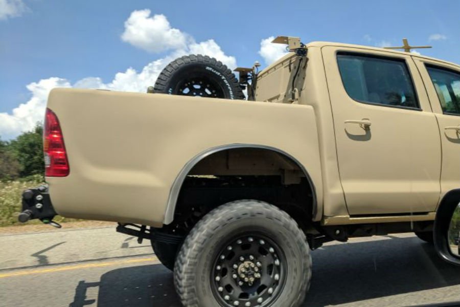Ένα τέτοιο κυκλοφορεί στα περίχωρα της Πενσυλβάνια των Η.Π.Α., αποτελώντας πρωτότυπο εξέλιξης για τοπικό προμηθευτή του αμερικανικού στρατού. Από τα χερούλια των θυρών και μόνο καταλαβαίνει κανείς τον σκοπό του σκληροπυρηνικού Toyota, ενώ και το bullbar με τα θεόρατα ελαστικά και την αυξημένη απόσταση από το έδαφος ενημερώνουν για το ποιόν του ιαπωνικού pick up. Βέβαια αντίστοιχου ύφους εκτός δρόμου πολιτικά οχήματα υπάρχουν πολλά. Αυτό που διακρίνει το συγκεκριμένο και του δίνει «βαθμό» στην ιεραρχία, είναι το πλήρως θωρακισμένο αμάξωμα, η χαρακτηριστική κεραία στην οροφή (είτε για ανίχνευση αντιπάλων, είτε για λειτουργία ασυρμάτου) και οι υποδοχές στην καρότσα για τοποθέτηση εκτοξευτήρων βλημάτων ή χρήση οπλοπολυβόλων.