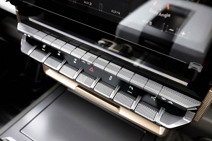Στο εσωτερικό, καμία σχέση με όσα είχαμε συνηθίσει στα Hummer, καθότι εδώ συναντάμε πλήρη ψηφιακότητα. Ο πίνακας οργάνων φτάνει τις 12,3 ίντσες και η «αιωρούμενη» οθόνη αφής στην κεντρική κονσόλα τις 13,4. Περιμετρικά του Hummer υπάρχουν 18 διαφορετικές κάμερες, ώστε ο οδηγός να ελέγχει με απόλυτη ακρίβεια το πού μπορεί να χωρέσει το τεράστιο αμάξωμα (διαστάσεις δεν ανακοίνωσαν ακόμα οι Αμερικανοί, όμως φαίνεται πως πρόκειται για «τέρας»).