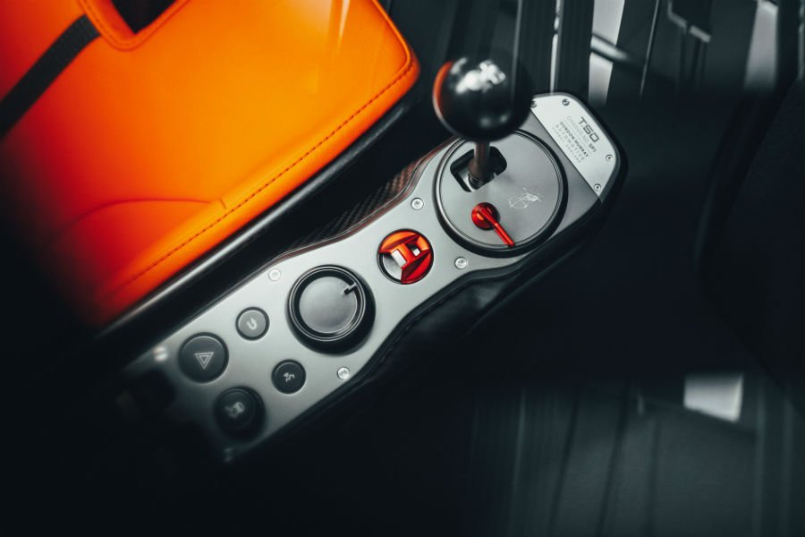 Από το ρελαντί στον κόφτη φτάνει μέσα σε μόλις 0,3 δλ., ενώ η ειδική ισχύς των 166 ίππων ανά λίτρο είναι η υψηλότερη για ατμοσφαιρικό μοτέρ στα χρονικά της αυτοκίνησης. Σε αντίθεση με τα υπόλοιπα supercars/hypercars, το T.50 μένει πιστό στην παράδοση και χρησιμοποιεί 6άρι χειροκίνητο κιβώτιο. Κατασκευάζεται από την Xtrac και ζυγίζει μόλις 80,5 κιλά, διαθέτοντας 5 κοντές σχέσεις και μια σχεδόν overdrive 6η.