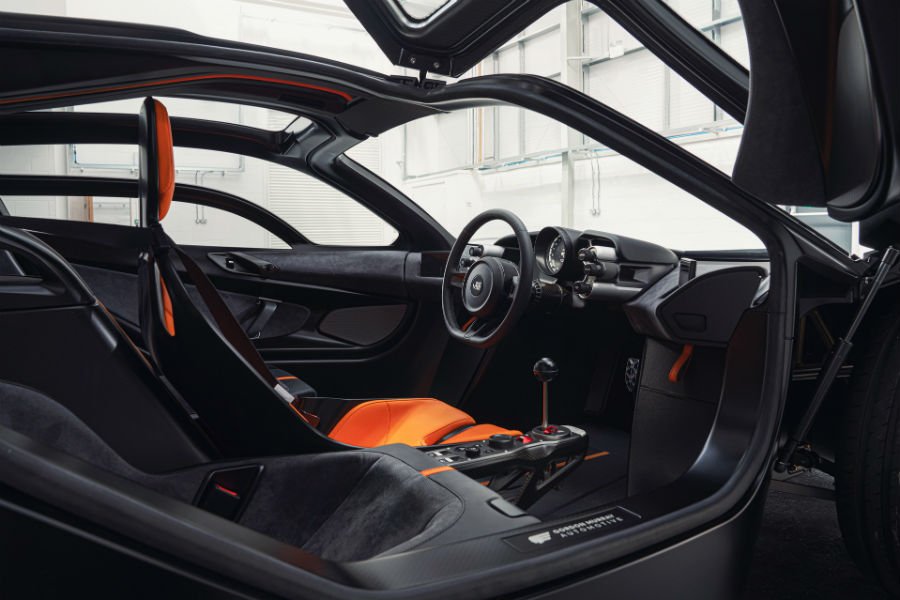 Στο εσωτερικό συναντάμε την κλασική τριθέσια διάταξη της F1, με το κάθισμα του οδηγού στο κέντρο και πιο μπροστά από τα άλλα δύο. Κεντρική κονσόλα δεν υπάρχει, έχοντας έναν βραχίονα στα δεξιά του κεντρικού καθίσματος να φιλοξενεί τον επιλογέα ταχυτήτων από τιτάνιο και τους διακόπτες του συστήματος πολυμέσων. Το ηχοσύστημα διαθέτει 10 ηχεία, τα Android Auto και Apple CarPlay είναι στάνταρ, ενώ κάμερες αντικαθιστούν τους εξωτερικούς καθρέπτες. Η πεταλιέρα δε, ζυγίζει 300 γρ. λιγότερο από τις αντίστοιχες των μονοθεσίων της Formula 1!