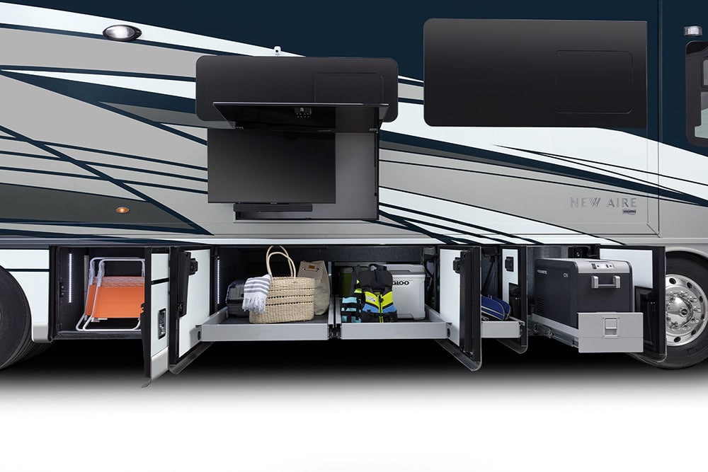 Tο νέο New Aire είναι γεμάτο με καινοτόμα χαρακτηριστικά και τεχνολογίες. Από την καμπίνα, με ραδιόφωνο Xite Dash με διπλές οθόνες 10 ιντσών, Nav-N-Go Navigation και Apple CarPlay μέχρι την καμπίνα με το τζάκι, την τηλεόραση LED Samsung 50 ιντσών και τα παράθυρα που παραπέμπουν σε σουίτα, το New Aire δεν τσιγκουνεύεται τις ανέσεις. Σε κάνει κυριολεκτικά να νιώθεις ότι ταξιδεύεις έχοντας πάρει μαζί το σπίτι σου. Όταν θελήσεις να χαλαρώσεις μπορείς να αναπαυτείς στους δερμάτινους καναπέδες του ή να μπεις για μπάνιο στην υπερσύγχρονη ντουζιέρα του. Στη συνέχεια, έχεις τη δυνατότητα να απολαύσεις το φαγητό στην άνετη τραπεζαρία και ακολούθως να πλύνεις τα ρούχα σου στο πλυντήριο-στεγνωτήριο που διαθέτει. Αφού λοιπόν κάνεις όλα αυτά, μπορείς να βυθιστείς στο King-Size κρεβάτι του.