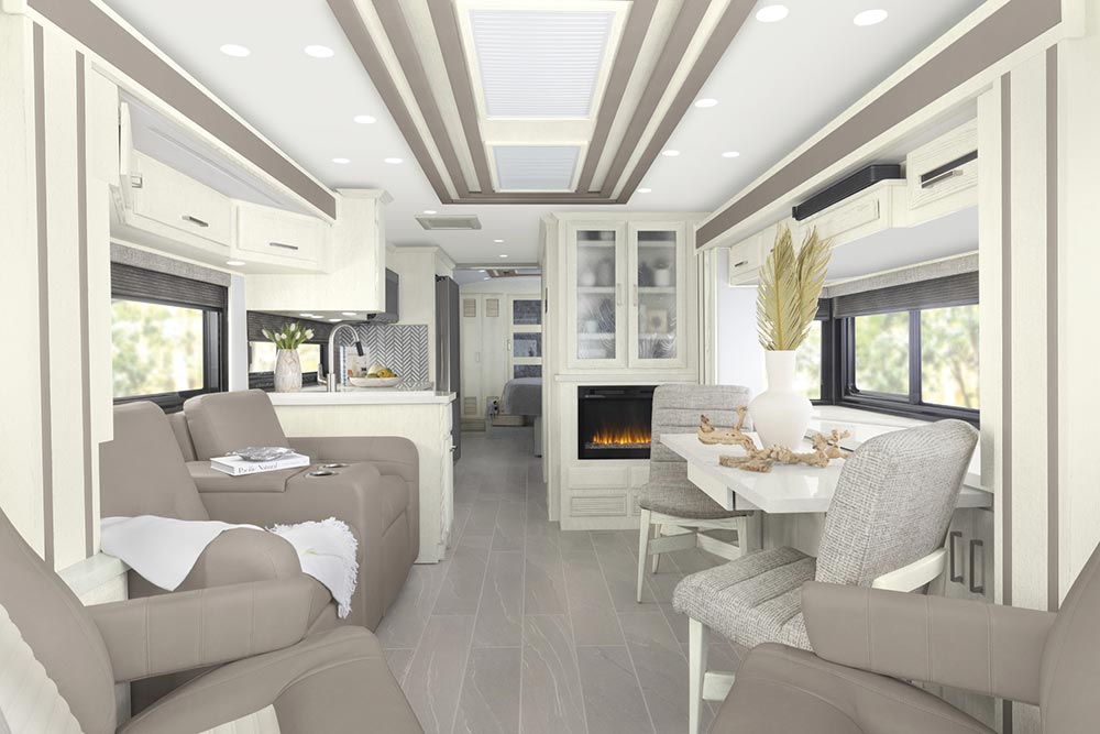 Πέρα όμως από τους χώρους, πάρα πολλά είναι και τα συστήματα ασφαλείας, τα οποία εξασφαλίζουν άνετα και ασφαλή ταξίδια. Το STAR Foundation βελτιώνει τη δύναμη και την ανθεκτικότητα, ενώ παρέχει μια πιο ήσυχη και πιο σταθερή οδήγηση από οποιοδήποτε άλλο όχημα αυτής της κατηγορίας. Ο κινητήρας ντίζελ Cummins και το προσαρμοζόμενο σύστημα διεύθυνσης Comfort Drive διατίθενται στάνταρ. Καλό θα ήταν πάντως να μην το παρακάνετε με τις εξορμήσεις του. Τα 10.668 χιλιοστά του μήκους του, τα 2.570 χιλιοστά του πλάτους, τα 4.445 χιλιοστά του ύψους του, σε συνδυασμό με το τεράστιο βάρος του θα σας επιτρέψουν να κινηθείτε σε έναν πολύ πολύ ελαφρύ χωματόδρομο. Όσο για την τιμή, ξεκινά από 613.785 δολάρια, δηλαδή από σχεδόν 558.000 ευρώ.