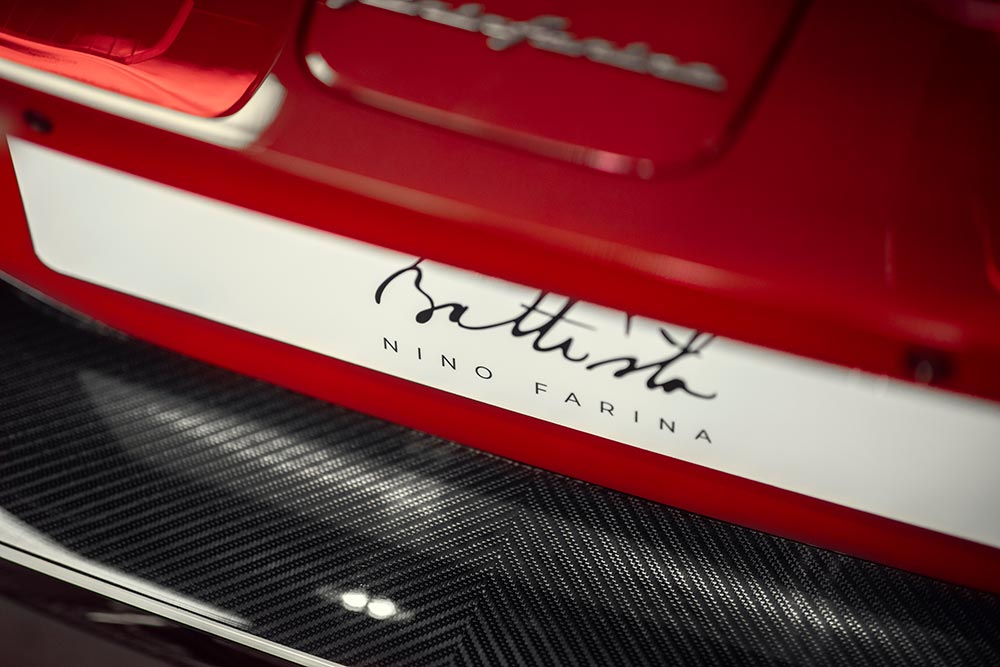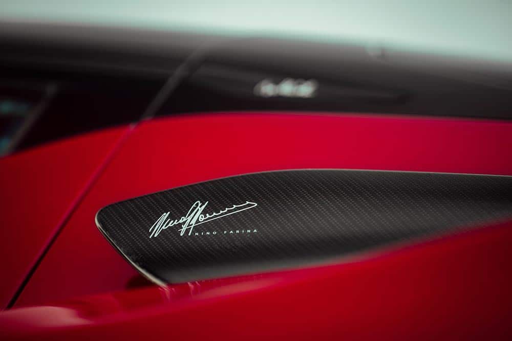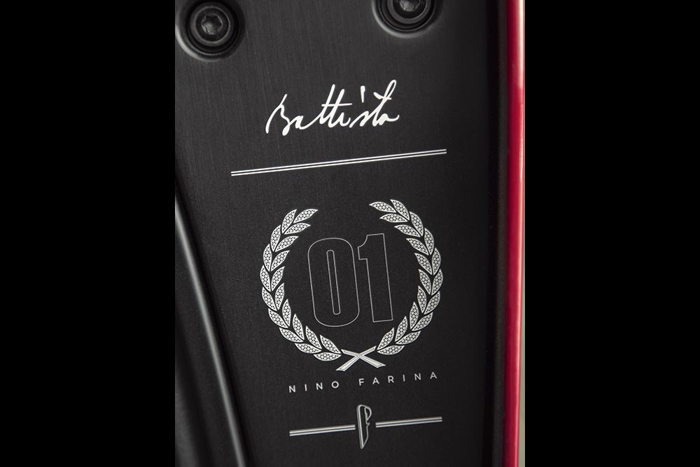 Σε ένα τόσο ξεχωριστό μοντέλο όπως αυτό όλα έχουν έναν συμβολισμό. Εξωτερικά, το αμάξωμα περιλούζεται από μια εντυπωσιακή απόχρωση κόκκινου χρώματος με την ονομασία Rosso Nino, προς τιμήν των αυτοκινήτων που έτρεξε ο Nino Farina. Η ξεχωριστή χρωματική παλέτα όμως δεν σταματά εδώ. Στο κάτω μέρος του δεσπόζουν δύο ακόμα ειδικά χρώματα, το Bianco Sestiere και το Iconica Blue, που εκτείνονται μέσω μιας λωρίδας τόσο στους καθρέφτες, όσο και στην πίσω πτέρυγα χαρίζοντας μια άρτια διχρωμία. Στο πίσω μέρος του αυτοκινήτου ξεχωρίζει το εντυπωσιακό γραφικό «01» δείχνοντας για άλλη μια φορά πως δεν πρόκειται για ένα συνηθισμένο hyper car.