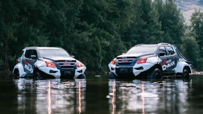 Το ένα μοντέλο ονομάζεται Concept X D-Max και, όπως γίνεται αντιληπτό, βασίζεται στο δημοφιλές pick-up έχοντας αυξημένη απόσταση από το έδαφος, που φτάνει τα 37 εκατοστά. Ενδεικτική η φωτογραφία που θέτει ενώπιος ενωπίω εργοστασιακό και βελτιωμένο D-Max, με την προστατευτική ποδιά του δεύτερου να βρίσκεται στο ύψος της μάσκας του κανονικού «θηρίου». Η αναβαθμισμένη ανάρτηση επιτρέπει μεγαλύτερη ελευθερία άρθρωσης, ενώ οι γωνίες προσέγγισης και διαφυγής προσεγγίζουν επίπεδα…αγωνιστικού Ντακάρ! Η πρώτη ανέρχεται σχεδόν στις 50 μοίρες (49,7 για την ακρίβεια) και η δεύτερη τις 38,5 μοίρες.