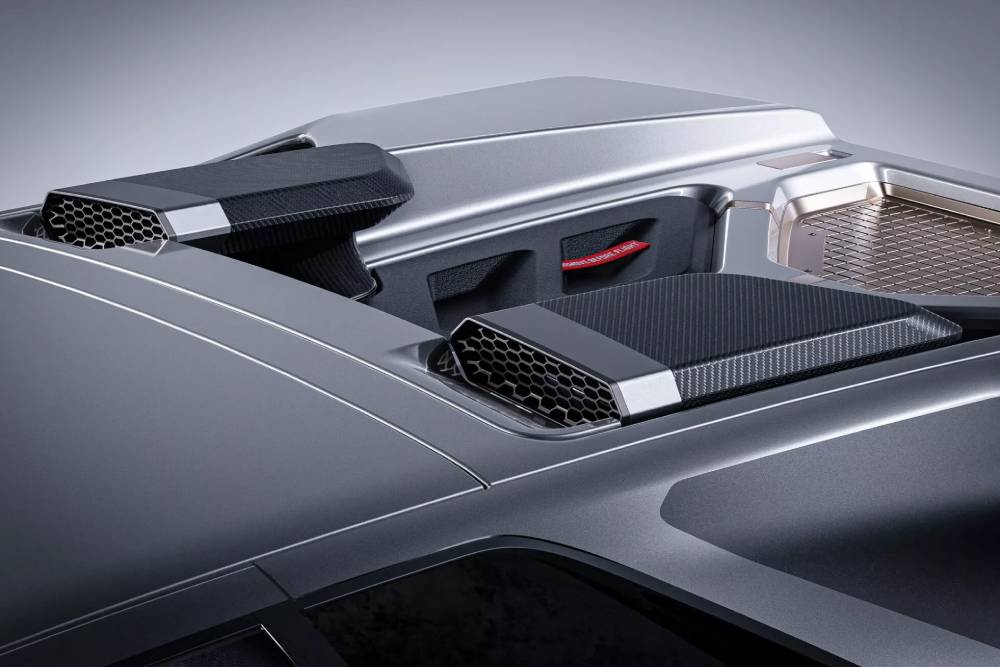Το αμάξωμα αντλεί ιδέες από τη θρυλική Diablo GTR, όπως φανερώνει το αεροδυναμικό πακέτο (splitter, ποδιές, διαχύτης) και οι αεραγωγοί πάνω από το κάλυμμα του κινητήρα, ενώ και οι 5άκτινες 19άρες ζάντες προέρχονται από τους αγώνες. Το σχέδιο πάντως θα μπορούσε να είναι πιο κοντά σε εκείνο της GTR, ενώ η απουσία της σταθερής αεροτομής «βγάζει μάτι». Το ίδιο ισχύει για τα διπλά «κανόνια» στο κέντρο του πίσω μέρους, που εκβάλλουν το σύστημα εξαγωγής. Η νέα Diablo χρησιμοποιεί εξωτικά υλικά στο κορμί της, περιλαμβανομένων ανθρακονημάτων και 3D εκτυπωμένων εξαρτημάτων.