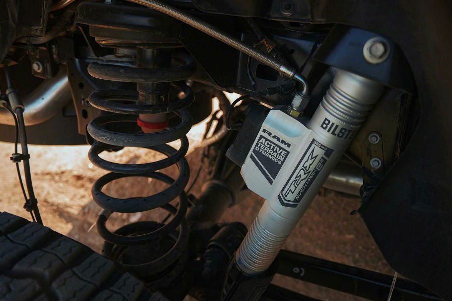 Για την εμφάνιση, βλέπετε. Καπό με αεραγωγούς, φουσκωμένα φτερά, μαύρο χρώμα σε μάσκα και προστατευτικά, μαζί με μια απόσταση από το έδαφος που φτάνει τα 30 εκατοστά, δημιουργούν μια εικόνα που πρέπει να οδηγείς τανκ για να μην κάνεις άκρη, σε περίπτωση που το δεις να σε πλησιάζει. Τα ηλεκτρονικά ελεγχόμενα αμορτισέρ Blackhawk E2 της Bilstein εξασφαλίζουν διαδρομή ανάρτησης 33 εκατοστών μπροστά και 35,5 πίσω, καθιστώντας το 1500 TRX πρακτικά ασταμάτητο. Το μέγιστο βάθος υδάτινου περάσματος δε, ξεπερνάει τα 81 εκατοστά! Εξυπακούεται πως υπάρχουν προστατευτικές ποδιές στο πάτωμα, καλύπτοντας όλα τα καίρια μηχανικά μέρη (κάρτερ, διαφορικά κλπ).