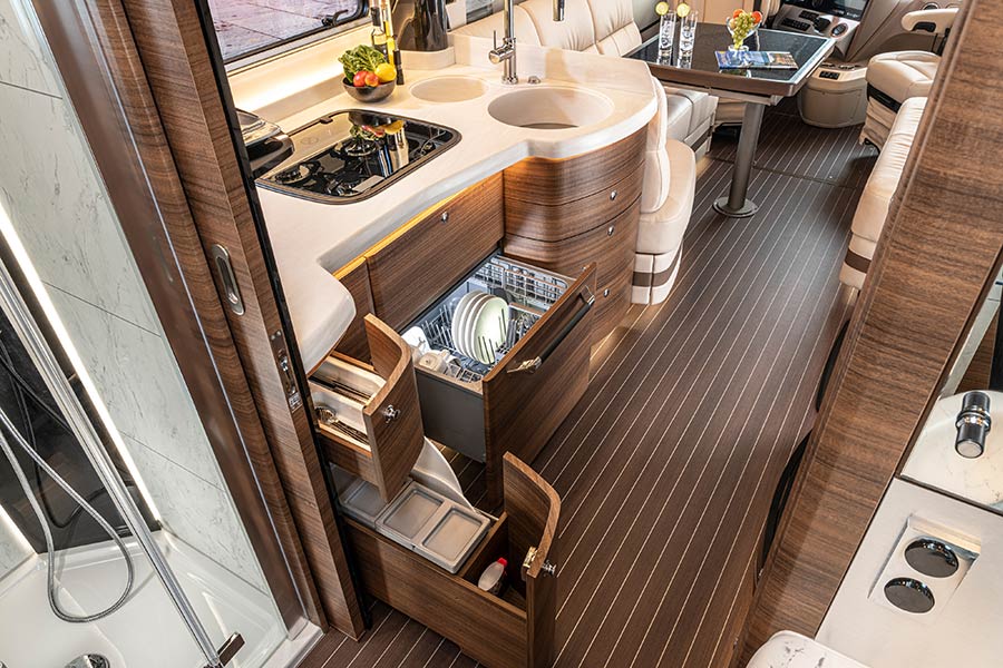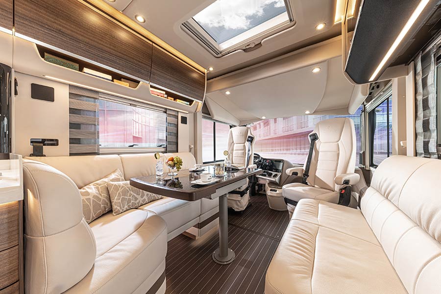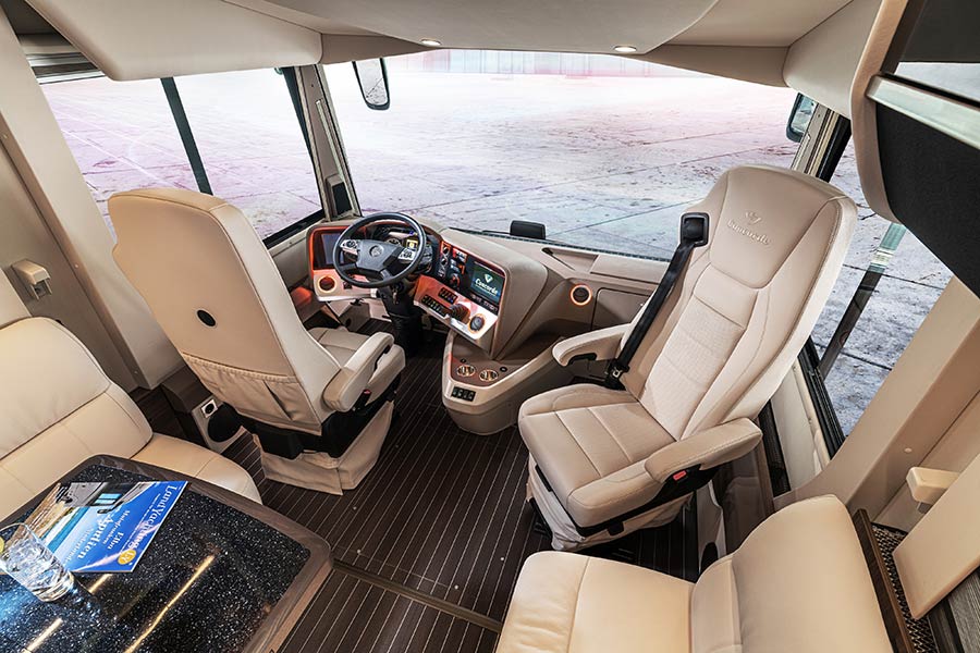Η καμπίνα των επιβατών προσφέρει αφθονία σε χώρους, πολυτέλεια και πρακτικότητα, σε σημείο που θυμίζει μια λουξ αυτοκινούμενη κατοικία με όλες τις ανέσεις. Το σαλόνι και η κουζίνα διαθέτουν άνετους δερμάτινους καναπέδες, τραπέζι κουζίνα γκαζιού, ανοξείδωτους νεροχύτες, ψυγείο 177 λτ., καταψύκτη 20 λτ., καφετέρια, πλυντήριο πιάτων, φούρνο μικροκυμάτων κ.λπ. Στο πίσω μέρος υπάρχει η τουαλέτα, νιπτήρας και κλειστό ντους, ενώ πιο πίσω βρίσκεται μια μεγάλη κρεβατοκάμαρα με ένα τεράστιο διπλό κρεβάτι, ντουλάπες, τηλεόραση και παράθυρα.
