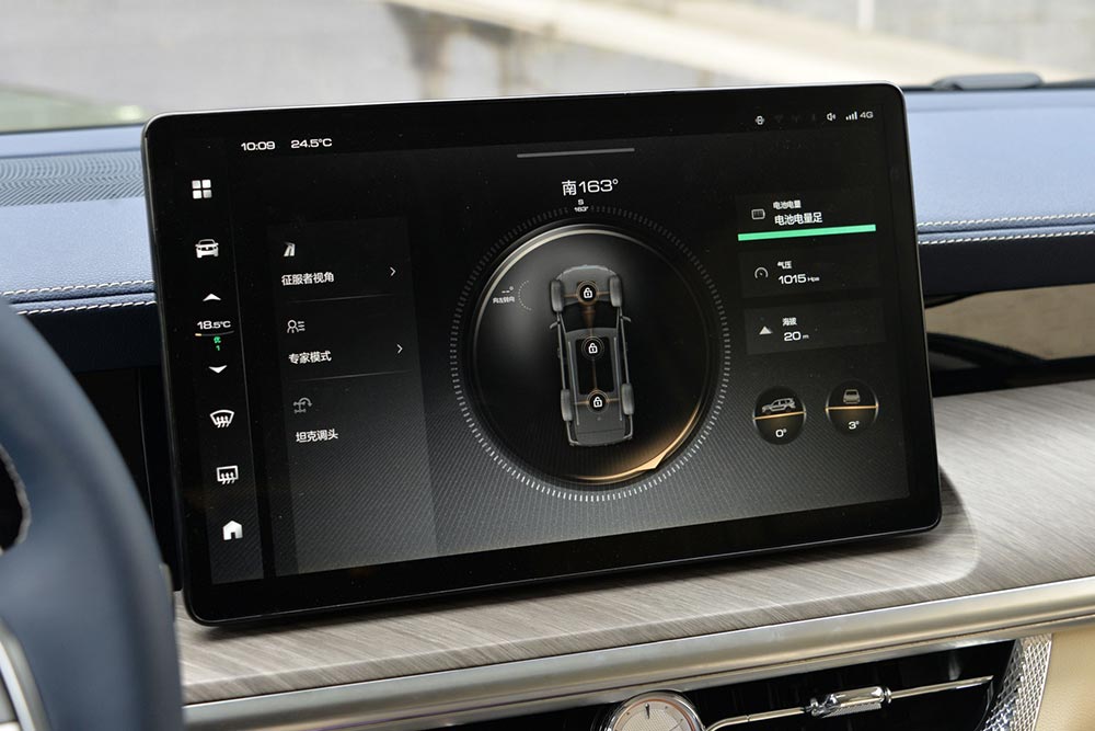 Πληθωρικό και πολυτελές είναι το εσωτερικό του Tank 500, όπου κυριαρχεί στο κέντρο του ταμπλό η μεγάλη οθόνη αφής των 14,6 ιντσών του συστήματος πολυμέσων. Μπροστά από τον οδηγό υπάρχει ο ψηφιακός πίνακας οργάνων των 12,3 ιντσών, ενώ τα διακοσμητικά ξύλου, οι νίκελ επενδύσεις και το δίχρωμο δερμάτινο σαλόνι ενισχύουν τον premium χαρακτήρα του.