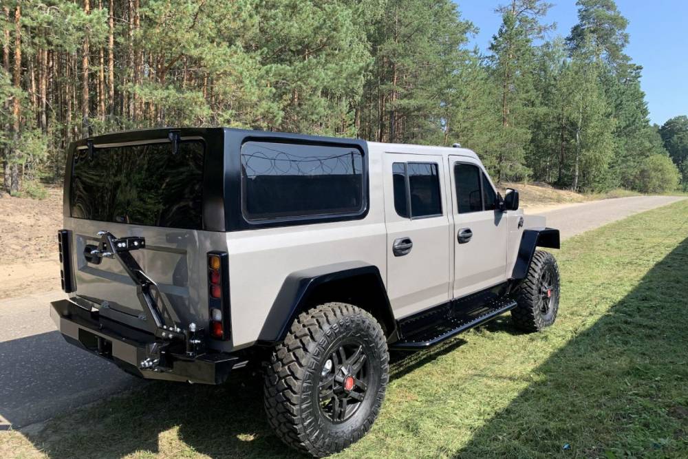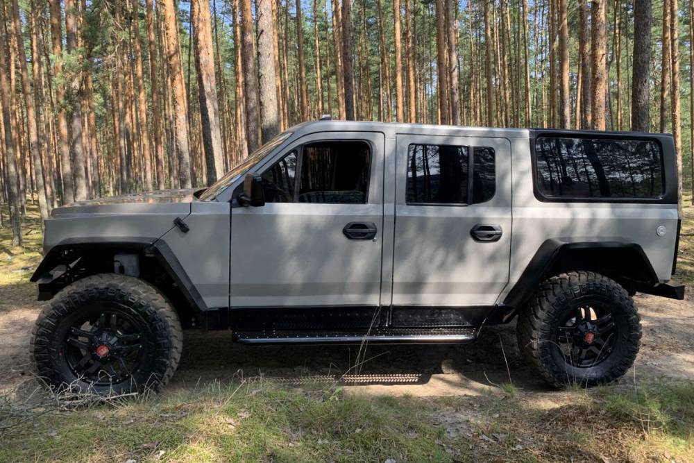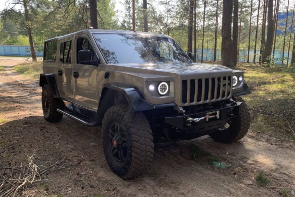 To πολιτικό, αντίθετα, παραπέμπει ευθέως στο Wrangler. Τα στρογγυλά φανάρια στις άκρες του αμαξώματος και η μάσκα με τις κάθετες γρίλιες, δεν αφήνουν την παραμικρή αμφιβολία ως προς την πηγή έμπνευσης. Διαστάσεις δεν ανακοινώνονται, ωστόσο οι Ρώσοι υποστηρίζουν πως είναι αρκετά κοντά σε αυτές του στρατιωτικού, που εκτείνεται σε 4,7 μέτρα μήκους, 2,2 μέτρα πλάτους και 2,1 μέτρα ύψος. Η απόσταση από το έδαφος φτάνει τα 250 χλστ., κάτι που πιθανότερα να ισχύει και για την έκδοση δρόμου.