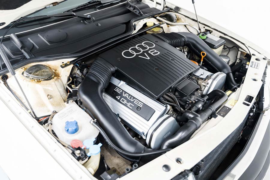 Κάτω από το μακρύ εμπρός καπό του φιλοξενείται ένας κινητήρας 3.6 λτ. 32 βαλβίδων V8 (υπήρχε και 4.2 λτ. V8), απόδοσης 250 ίππων στις 5.800 σ.α.λ. και 340 Nm ροπής στις 4.000 σ.α.λ. Με το αυτόματο κιβώτιο των 4 ταχυτήτων (στάνταρ ήταν 5άρι μηχανικό) και την τετρακίνηση quattro, το μεγάλο Audi V8 επιτάχυνε στο 0-100 χλμ./ώρα σε 9,9 δλ. και η τελική ταχύτητα έφτανε τα 232 χλμ./ώρα (7,6 δλ. και 244 χλμ./ώρα με το χειροκίνητο).