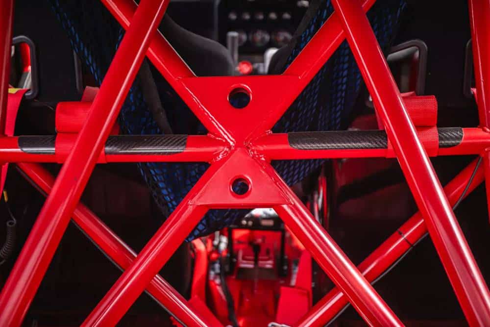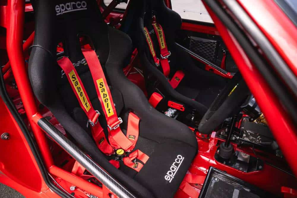 Το κατακόκκινο 309 GTi ξεκίνησε την καριέρα του σαν κάθε άλλο, μόνο που ετούτο είχε το προνόμιο να πέσει στα χέρια επαγγελματία μηχανικού – και μάλιστα ενός με θητεία στην Prodrive. Με τόση εμπειρία στην προετοιμασία αγωνιστικών ράλλυ (πιθανότατα επιπέδου WRC), η μοίρα του Peugeot ήταν προδιαγεγραμμένη. Τρία χρόνια πέρασε στο συνεργείο, έως ότου να μεταμορφωθεί σε μια κατασκευή έτοιμη για track days ή αναβάσεις. Καταρχάς το αμάξωμα, που είναι γεμάτο fiberglass πλέον και ασύγκριτα φουσκωμένο. Μετά έχουμε τις 17άρες της Speedline, που θυμίζουν Delta Integrale. Έπειτα, περνάμε στο «χαμό» που επικρατεί από κάτω.
