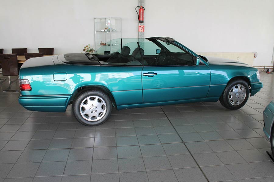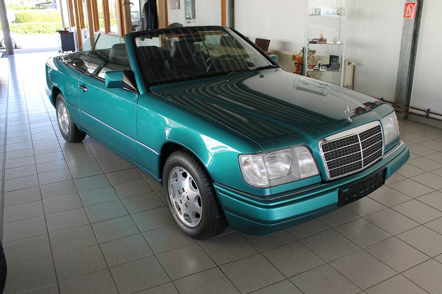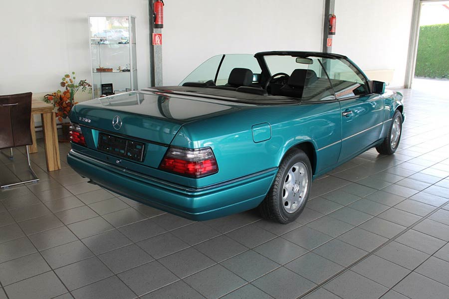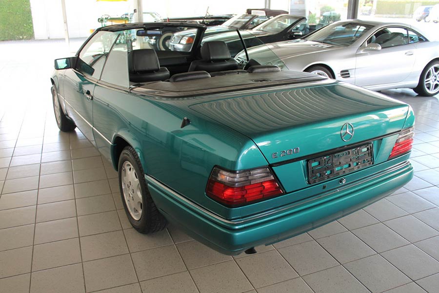 Η Mercedes E-Class Cabrio είναι αυτή που κράτησε την παραγωγή μέχρι το 1997. Από τα τελευταία οχήματα που κατασκευάστηκαν, είναι η εικονιζόμενη E 200 Cabrio, ταξινομημένη τον Σεπτέμβριο του 1997. Έκτοτε διατηρήθηκε στην εργοστασιακή της κατάσταση, αφού έχει διανύσει μόνο 8.030 χιλιόμετρα! Αναμενόμενα, ένα τέτοιο σπάνιο αυτοκίνητο σήμερα και σε μουσειακή μάλιστα κατάσταση, πωλείται για αρκετά χρήματα. Συγκεκριμένα 52.990 ευρώ ζητούνται για τη λαμπερή αυτή πράσινη Ε 200 Cabrio, από την εμπορία Lamminger, που βρίσκεται στην πόλη Χεβρώνα της Γερμανίας.