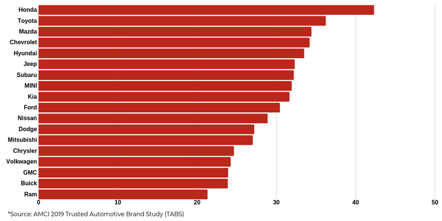Σύμφωνα με τη νέα ετήσια έρευνα Trusted Automotive Brand Study (TABS) της αμερικάνικης εταιρείας AMCI που ασχολείται με το marketing στο χώρο του αυτοκινήτου, η Alfa Romeo και η Honda είναι οι πιο έμπιστες μάρκες. Η ιταλική στην κατηγορία των premium μαρκών και η ιαπωνική στις μη πολυτελείς μάρκες (βλ. παρακάτω σχεδιαγράμματα).
