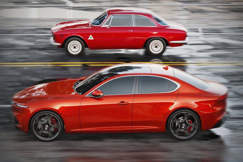 «Το αυτοκίνητο είναι τούμπανο, απλά πράγματα. Δεν θα δίναμε το οκ για τις τελικές γραμμές της σχεδίασης, αν δεν είμασταν απολύτως ερωτευμένοι μαζί της. Και μπορώ με σιγουριά να σας πω ότι πλέον, είμαστε – και παραείμαστε», λέει ο Jean-Philippe Imparato γεμάτος περηφάνια. Ο ψηφιακός σχεδιαστής Sugar Chow, γνωστός και ως sugardesign_1, έβαλε τη φαντασία και το υπολογιστικό πρόγραμμα να τρέχει, δημιουργώντας ένα σεντάν που αντλεί επιρροές από την Tonale, αλλά τις ενσωματώνει σε ένα αμάξωμα με έμπνευση από την Alfetta και την πρώτη Giulia, της δεκαετίας του 60! Ο Chow μάλλον μπερδεύτηκε και έβαλε την Giulia GTV δίπλα στο rendering της επόμενης Giulia, αλλά ουδόλως δεν μας ενοχλεί. Στο προφίλ εξάλλου, ειδικά στην κλίση και το σχήμα της τρίτης κολώνας, αλλά και τη σύνδεσή της με τον τρίτο όγκο του αμαξώματος, η «νέα» αντιγράφει αρκετά την παλιά.