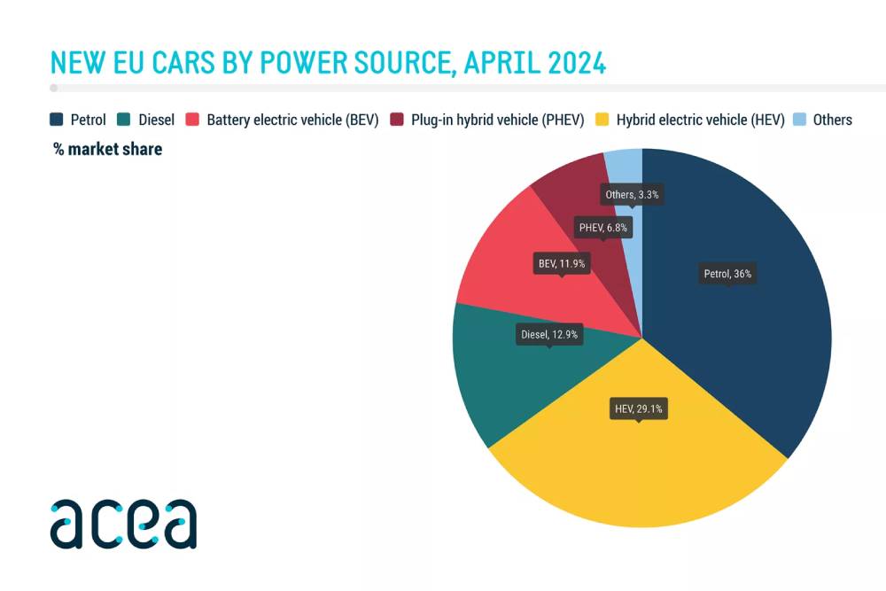 Οι αριθμοί της Ένωσης Ευρωπαίων Κατασκευαστών Αυτοκινήτων (ACEA) δείχνουν την ξεκάθαρη προτίμηση του αγοραστικού κοινού στους θερμικούς κινητήρες, καθώς σχεδόν το 50% των ταξινομήσεων αφορούν μοντέλα με μοτέρ βενζίνης ή πετρελαίου – και μάλιστα όχι full, αλλά το πολύ mild hybrid. Το 48,9% των πωλήσεων για το μήνα Απρίλιο αφορούσε αμόλυβδη και ντίζελ, με την πρώτη να παίρνει τη μερίδα του λέοντος έναντι της αυτανάφλεξης (36% έναντι 12,9%). Τα αυτοφορτιζόμενα υβριδικά μπήκαν ανάμεσα, με 29,1%, ενώ τα ηλεκτρικά περιορίστηκαν στο 11,9%. Ωστόσο κατάφεραν να ξεπεράσουν εύκολα τα plug-in υβριδικά, που δεν μπόρεσαν να υπερβούν ούτε το 7% σε μερίδιο αγοράς (6,8%).