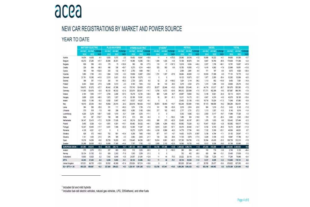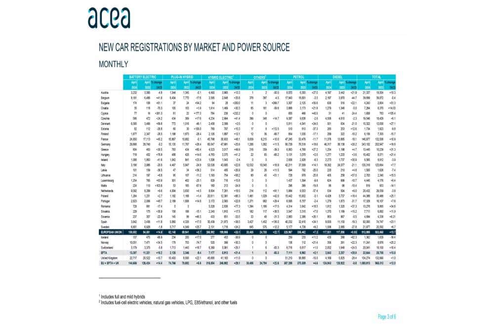 Γεγονός είναι πάντως, ότι η ζήτηση για εξηλεκτρισμένα αυτοκίνητα συνεχίζει να αυξάνεται σε ολόκληρη την Ευρωπαϊκή Ένωση. Οι πωλήσεις παραδοσιακών υβριδικών οχημάτων αυξήθηκαν κατά 33,1% τον Απρίλιο, λόγω της αύξησης 48,1% στη Γαλλία, 38,5% στην Ισπανία και 25,9% στη Γερμανία, φτάνοντας συνολικά τα 265.992 κομμάτια για τον Απρίλη. Οι πωλήσεις των plug-in υβριδικών οχημάτων αυξήθηκαν κατά 3,7% τον περασμένο μήνα, φτάνοντας συνολικά τις 62.148 μονάδες. Οι ταξινομήσεις των αμιγώς ηλεκτρικών επίσης αυξήθηκαν κατά 14,8% τον περασμένο μήνα (108.552 μονάδες), σημειώνοντας τη μεγαλύτερη άνοδο σε Γαλλία (+45,2%) και Βέλγιο (41,6%). Μεταξύ Ιανουαρίου και Απριλίου, 441.992 νέα ηλεκτρικά αυτοκίνητα με μπαταρία ταξινομήθηκαν σε ολόκληρη την ΕΕ, σημειώνοντας αύξηση 6,4%.