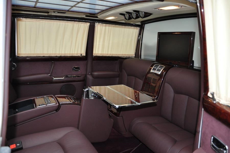 Στο θάλαμο των επιβατών κάθε επιφάνεια είναι ντυμένη με ακριβό δέρμα, ενώ περιλαμβάνει ακόμα ηλεκτρικά ρυθμιζόμενα, θερμαινόμενα και αεριζόμενα καθίσματα, ψυγείο, minibar, επενδύσεις Swarovski, μεγάλη οθόνη, ηχοσύστημα dolby surround, ξύλινα τραπεζάκια, σύστημα πολυμέσων και πολλά ακόμη.