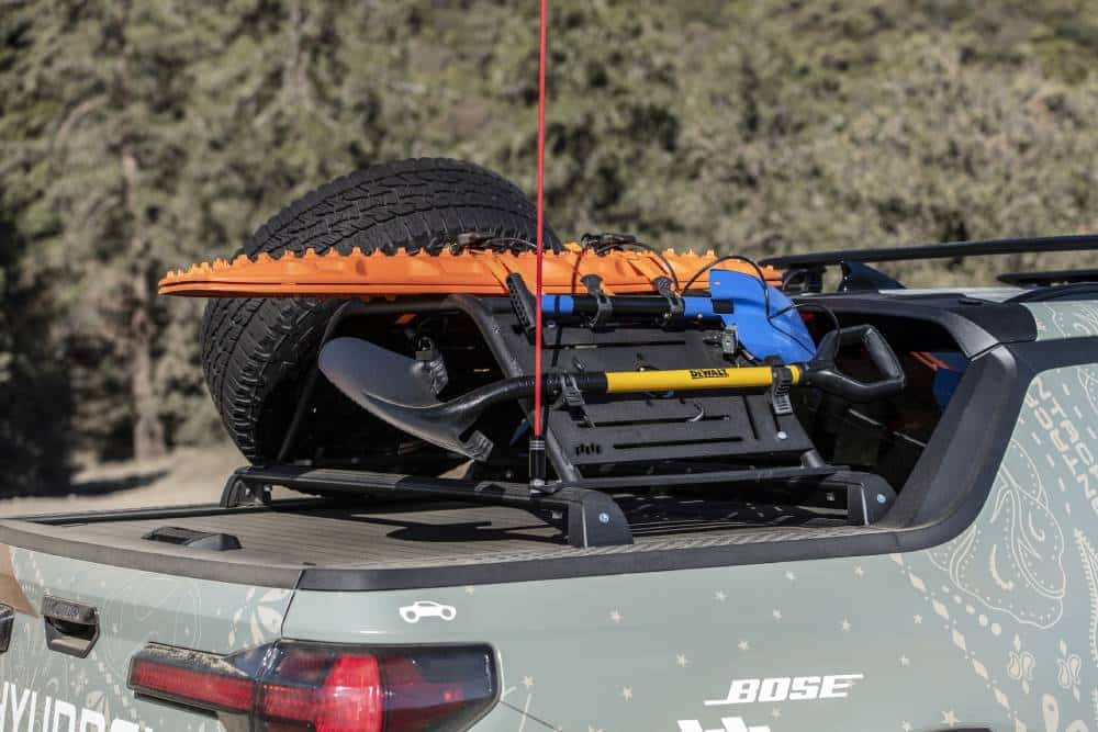 O μηχανικός της κορεατικής εταιρίας, Eric Bruxton, ανέλαβε να «χτίσει» το Santa Cruz και να το καταστήσει ακόμα ικανότερο εκτός δρόμου. Η αρχή έγινε με την τοποθέτηση ατσάλινων προστατευτικών ποδιών εμπρός-πίσω και ενισχυμένων 17άρων ζαντών, που περιβάλλονται από αμιγώς χωμάτινα ελαστικά Falken Wildpeak. Προφανέστατα αν δεν άλλαζε η ανάρτηση όλα θα πήγαιναν χαμένα, οπότε ένα κιτ ανύψωσης φροντίζει να σηκώσει το Santa Cruz σχεδόν 22 εκατοστά πάνω από το έδαφος (218 χλστ.). Η Rally Innovations ανέλαβε την παροχή του ανάλογου off road εξοπλισμού, που περιλαμβάνει μπάρα LED και γάντζο πρόσδεσης στη μάσκα, αλλά και ειδική βάση στην καρότσα για τη μεταφορά έξτρα τροχών, φτυαριών, αποθηκευτικών χώρων και πλατφορμών (τα πορτοκαλί στοιχεία), που τοποθετούνται κάτω από τους τροχούς για να ξεκολλήσουν το αυτοκίνητο σε τυχόν δύσκολες στιγμές.