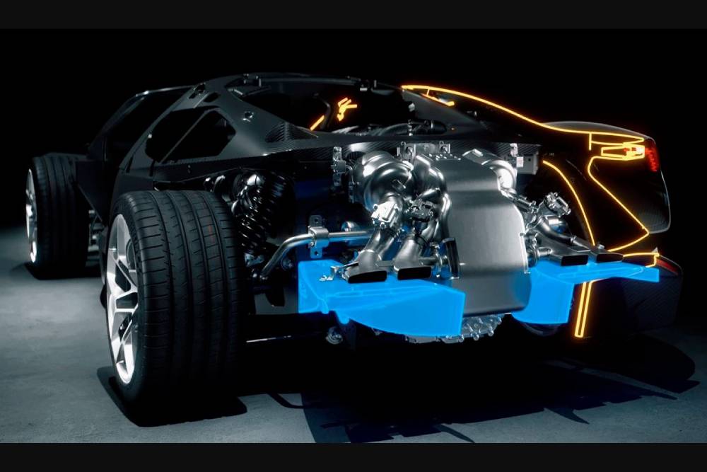 Κάτω από το φαντασμαγορικό αμάξωμα συναντάμε τον προαναφερθέντα ολοκαίνουργιο ατμοσφαιρικό V16 των 8.3 λίτρων εξελιγμένου από την Cosworth, που παράγει 1.000 άλογα στις 9.000 σ.α.λ.! Αφού συνέλθεις από το σοκ (σημειωτέον, 1.001 άλογα είχε ο 8.0 W16 quadturbo της Veyron), έρχονται τα τρία ηλεκτρο-σοκ. Συνολικά, το δεξί πόδι του οδηγού προστάζει 1.800 άλογα, τα οποία περνάνε στους τροχούς μέσω 8τάχυτου αυτόματου κιβωτίου διπλού συμπλέκτη. Μια μπαταρία 25 kWh φροντίζει για την ενέργεια των ηλεκτροκινητήρων, παρέχοντας μέχρι 60 χλμ. ηλεκτρικής αυτονομίας.