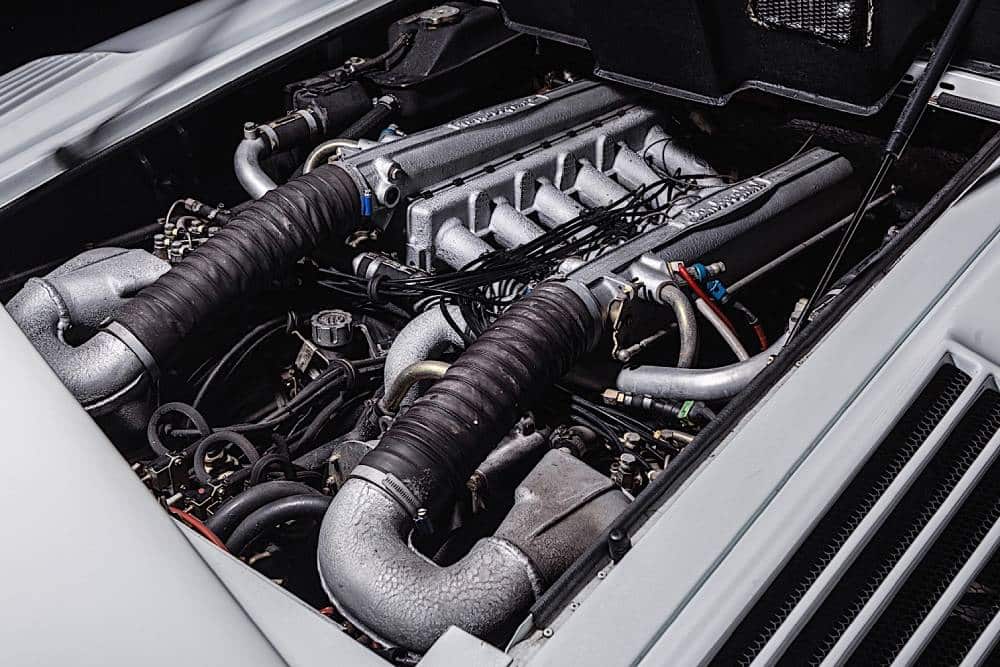 Με τέτοιο χολιγουντιανό παρελθόν, όμως, και τον συλλεκτικό χαρακτήρα που συνοδεύει όλες τις Countach, δεν υπήρχε περίπτωση να αποτελέσει ευκαιρία αγοράς τρακαρισμένου μεταχειρισμένου. Ειδικά όταν πρόκειται για μια από τις μόλις 658 25th Anniversary που κατασκευάστηκαν. Κάτω από το κακοποιημένο, αλλά σταθερά σαγηνευτικό, αμάξωμα αναλαμβάνει ο ατμοσφαιρικός V12 των 5.167 κ.εκ., με σύστημα ψεκασμού της Bosch και απόδοση 420 ίππων, μαζί με 500 Nm ροπής (η ευρωπαϊκή είχε 6 διπλά καρμπιρατέρ Weber και απέδιδε 450 ίππους). Η ισχύς μεταφέρεται στους πίσω τροχούς και τα πελώρια ελαστικά των 345 χλστ. -σε 15άρες ζάντες- μέσω 5τάχυτου χειροκίνητου κιβωτίου. Τα 100 χλμ./ώρα από στάση όταν ήταν καινούργια έρχονταν σε 4,7 δλ. και η τελική ταχύτητα έφτανε τα 295 χλμ./ώρα.