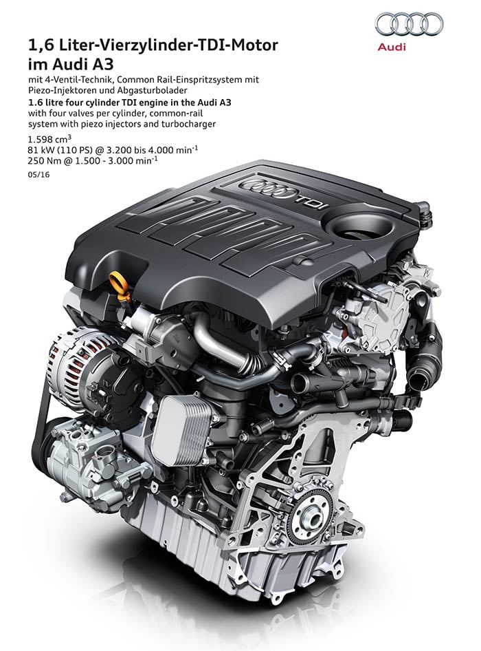 Ο λόγος γίνεται για τον πετρελαιοκινητήρα 1.6 TDI, ο οποίος δεν περιλαμβάνεται σε κανένα μοντέλο της Audi. Άλλωστε σε όλα τα καινούργια μοντέλα του ομίλου VW, ο μικρότερος ντίζελ είναι ο 2.0 TDI, σε εκδόσεις με διαφορετικές αποδόσεις.