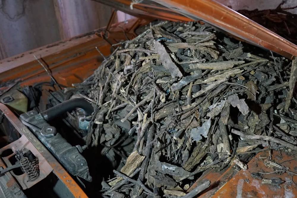 Κάτω από τις φωλιές που έχουν σχηματίσει και τα καλώδια/πλαστικά που έχουν φάει τα ποντίκια, μετά βίας διακρίνουμε έναν εξακύλινδρο κινητήρα. Δεδομένου ότι πρόκειται για μοντέλο του 1970, το μοτέρ αριθμεί 3.687 κ.εκ. και στα καλά του απέδιδε 145 ίππους στις 4.000 σ.α.λ. Εν ολίγοις, μιλάμε για τη βασική έκδοση του μοντέλου. Ένα 3τάχυτο μηχανικό κιβώτιο φρόντιζε για την τροφοδότηση των πίσω τροχών, όμως πλέον περισσότερο διακοσμητικό είναι. Ο κινητήρας, πασιφανώς, δεν παίρνει μπροστά – και ουδείς γνωρίζει πόση δουλειά χρειάζεται, προκειμένου να επανέλθει στη ζωή. Ωστόσο, το αυτοκίνητο θα μπορούσε να αποτελέσει ιδανική περίπτωση αναπαλαίωσης.