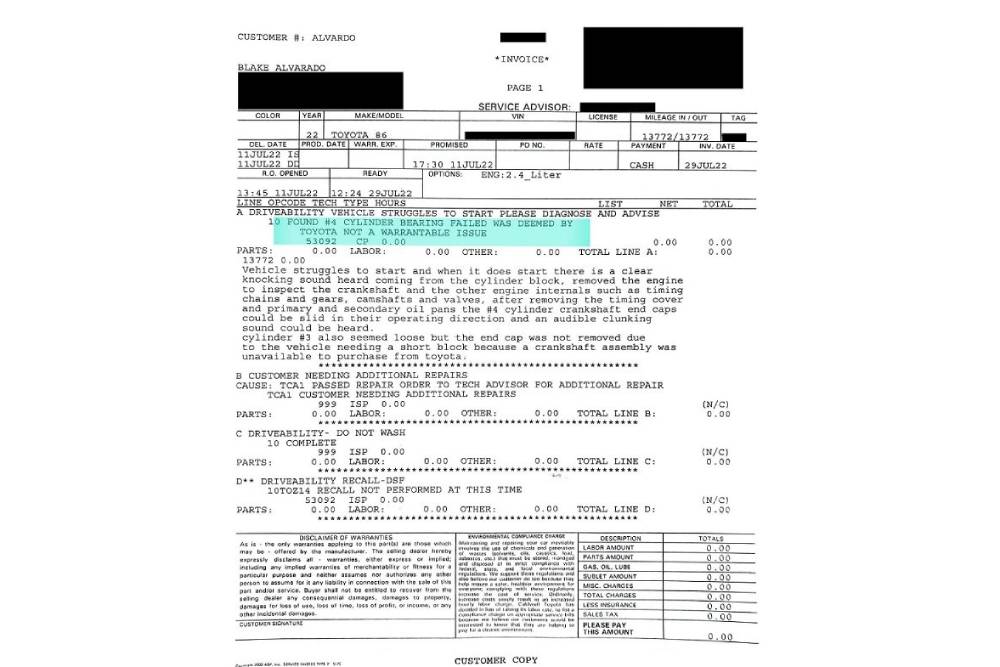 Στις 10 του προηγούμενου μηνός, ο boxer των 2.4 λίτρων παρέδωσε πνεύμα. Η εξέταση έδειξε πλήρη διαρροή λαδιού, λόγω σπασμένου κουζινέτου σε μια μπιέλα. Ο Alvarado ανέφερε επίσης παρουσία μονωτικού στο δοχείο αναθυμιάσεων, τονίζοντας πως το ίδιο πρόβλημα έχει παρατηρηθεί και σε άλλα GR86. Από τη στιγμή που το αυτοκίνητο είναι μόλις 1 έτους και η βλάβη φαινόταν να προέρχεται από αστοχία υλικού, ο κάτοχος του GR86 είχε κάθε ελπίδα να πιστεύει πως θα τον κάλυπτε η εγγύηση. Η Toyota, ωστόσο, είχε εντελώς διαφορετική γνώμη.