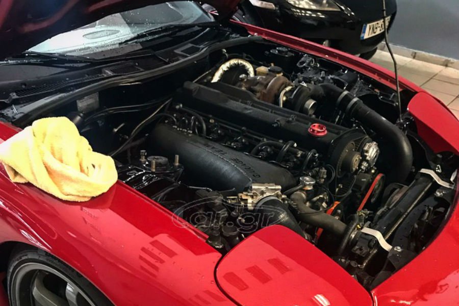 Σε αυτές, εντοπίσαμε ένα μοναδικό εν Ελλάδι δείγμα και σίγουρα από τα πιο σπάνια της Ευρώπης. Το εν λόγω κατακόκκινο FD προφανώς είναι βελτιωμένο, όπως φανερώνουν οι 18άρες ζάντες GR3 της Japan Racing και η μικρή απόσταση από το έδαφος, που προέρχεται από τη ρυθμιζόμενη ανάρτηση της Bilstein. Ο εμπρός προφυλακτήρας και τα πλαϊνά μαρσπιέ επίσης φανερώνουν βελτίωση, η οποία γίνεται πρόδηλη όταν ανοίξει το καπό.