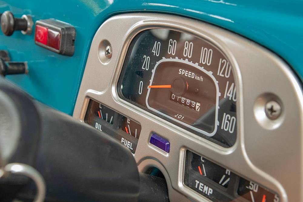 Όλες οι επενδύσεις είναι ανανεωμένες και κάνουν την καμπίνα του Land Cruiser να φαντάζει καλύτερη από καινούργια, έχοντας μια μικρή διαφοροποίηση τεχνολογίας στο ταμπλό, όπου συναντάμε μια «πηγή» με λειτουργία Bluetooth. Κατά τα άλλα, τα ενδότερα του ιαπωνικού 4×4 θυμίζουν 1960! Τη χρονιά, δηλαδή, που παρουσιάστηκε. Έμεινε στην παραγωγή μέχρι το 1984, με ελάχιστες αλλαγές, και το συγκεκριμένο ανήκει σε μια από τις τελευταίες παρτίδες, όντας μοντέλο του ’81.