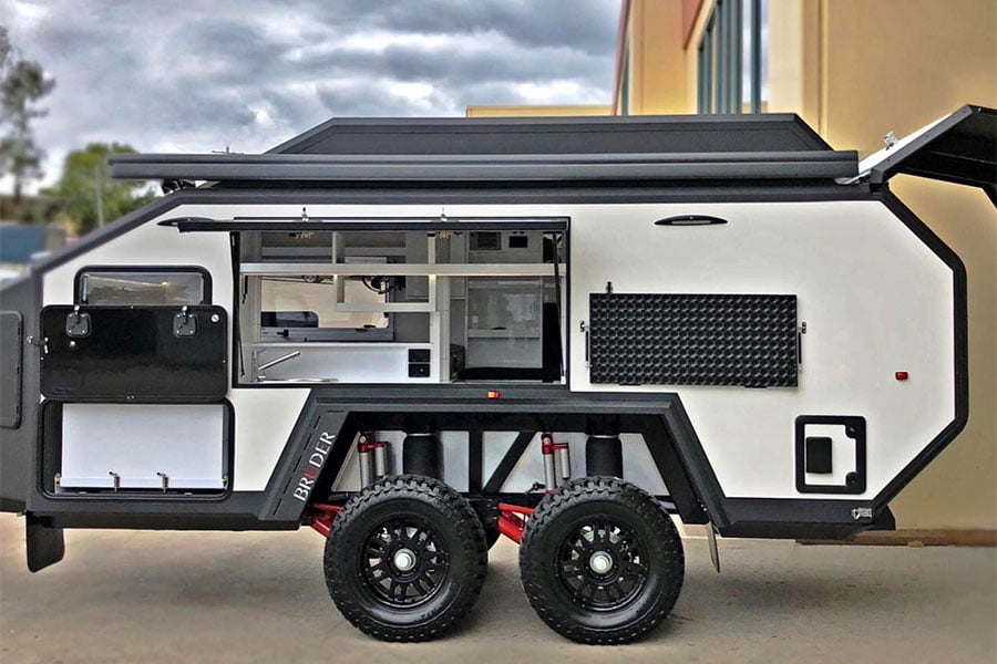Με το εν λόγω τροχόσπιτο, αυστραλιανής κατασκευής, δεν θα έχετε να σκεφτείτε τίποτε. Απλά βγάλτε το χάρτη κι επιλέξτε προορισμό, ώστε να κάνετε τις διακοπές σας μακριά από συμβατικά τουριστικά καταλύματα. Όσο κακοτράχαλος κι αν είναι ο δρόμος, η εξελιγμένη αερανάρτηση πολλαπλών συνδέσμων που διαθέτει κι η αυξημένη απόσταση από το έδαφος των 65 εκατοστών, θα σας επιτρέψουν να αφήσετε πίσω σας κάθε εμπόδιο. Η καμπίνα είναι στεγανή, με το τροχόσπιτο να μπορεί να επιπλεύσει (!) αν χρειαστεί. Για τα δύσκολα, το Brüder EXP 6 GT, ενσωματώνει και δικό του βαρούλκο, με εξαιρετικά ενισχυμένο συρματόσχοινο.