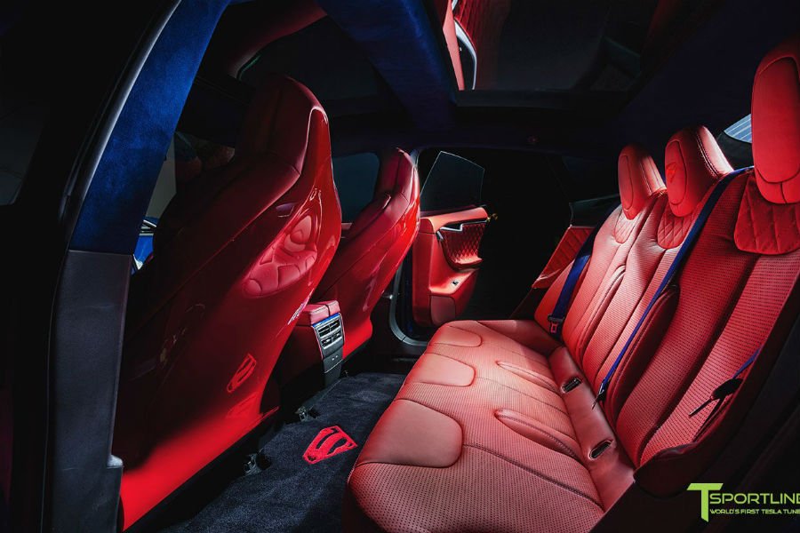 Η T Sportline είναι κάτι σαν τον επίσημο βελτιωτή της Tesla. Οι αναβαθμίσεις δεν αφορούν τα μηχανικά μέρη, αλλά τις δυνατότητες εξατομίκευσης και εμφανισιακής διαφοροποίησης. Τομείς στους οποίους αριστεύει το Project Superman. Όπως βλέπουμε, το εν λόγω Μodel S P100D είναι βαμμένο στο βαθύ μπλε της στολής του τελευταίου τέκνου του Κρύπτον. Αντιστοίχως, τα σήματα της Tesla είναι βαμμένα σε κόκκινο αντικατοπτρίζοντας το κόκκινο «S» και την φημισμένη κάπα του alter ego του Κλαρκ Κεντ. Το εξωτερικό look ολοκληρώνεται από τις μαύρες ζάντες αλουμινίου των 21 ιντσών και το φιλέτο ανθρακονήματος στο πορτμπαγκάζ. Μέσα, ωστόσο, είναι που γίνεται «πανηγύρι».