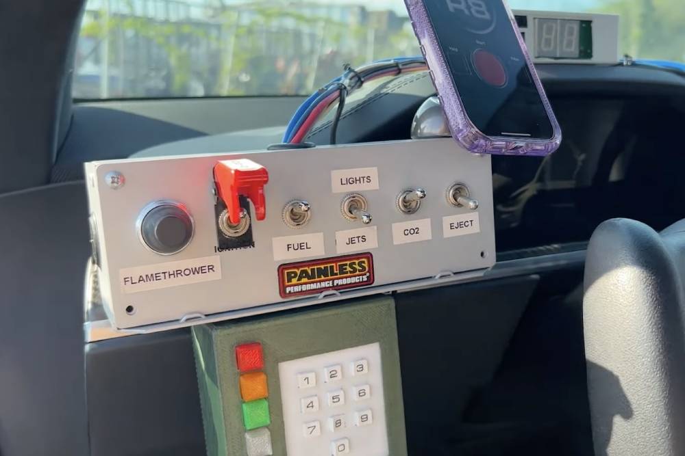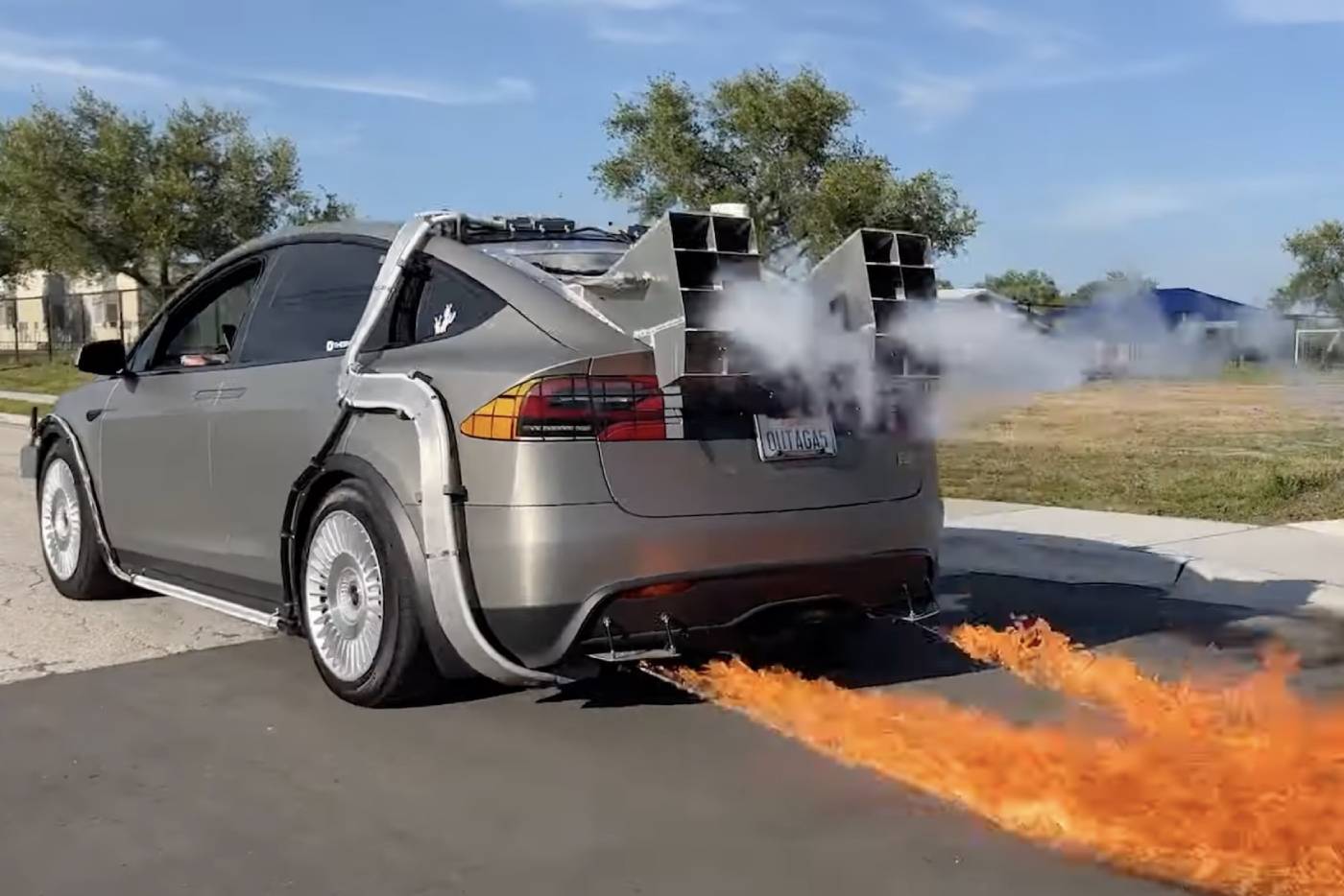 Το αντίθετο ισχύει για τα πίσω φωτιστικά σώματα. Ο κάτοχος του ηλεκτρικού SUV ακολούθησε τη «μπακαλίστικη» επιλογή των αυτοκόλλητων, που κάνουν τα φανάρια να μοιάζουν με εκείνα του κεντρομήχανου sportscar από τα 80’s. Δυστυχώς φαίνονται με την πρώτη ματιά ότι είναι ψεύτικά, χαλώντας και την ωραία λεπτομέρεια του «TMC» στο κέντρο της πόρτας του πορτμπαγκάζ (και στη μάσκα), ως παραλλαγή του «DMC». Οι «εξατμίσεις» που βγάζουν κανονικό καπνό και το πραγματικό (!) φλογοβόλο όμως, αναπληρώνουν με το πολύ παραπάνω και αναπαριστούν μαεστρικά τις σκηνές όπου το DeLorean έβαζε φωτιά στην άσφαλτο, την ώρα που άλλαζε χρονικό συνεχές.